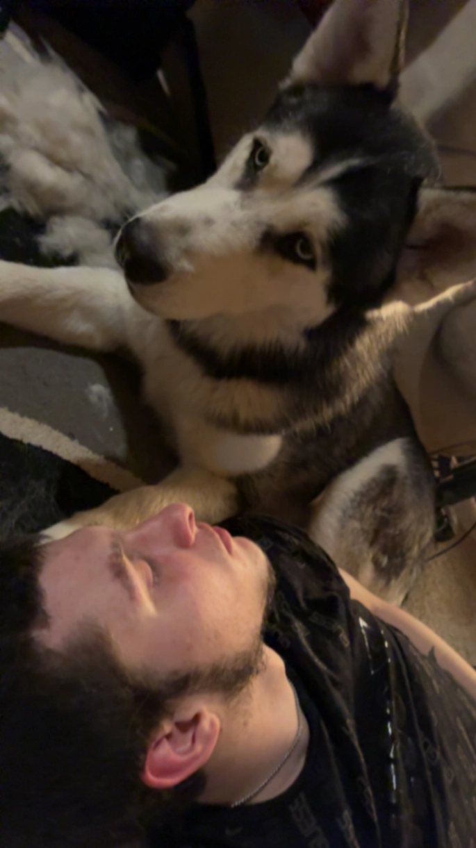 Khaos Bug is the brindle and white pup in photo. Comes to horse clicks and answers to khaos or bug. He is a service dog, but has separation anxiety. Wearing a green and black collar, licensed and chipped. Last seen at 1:45 pm today 3/15/26