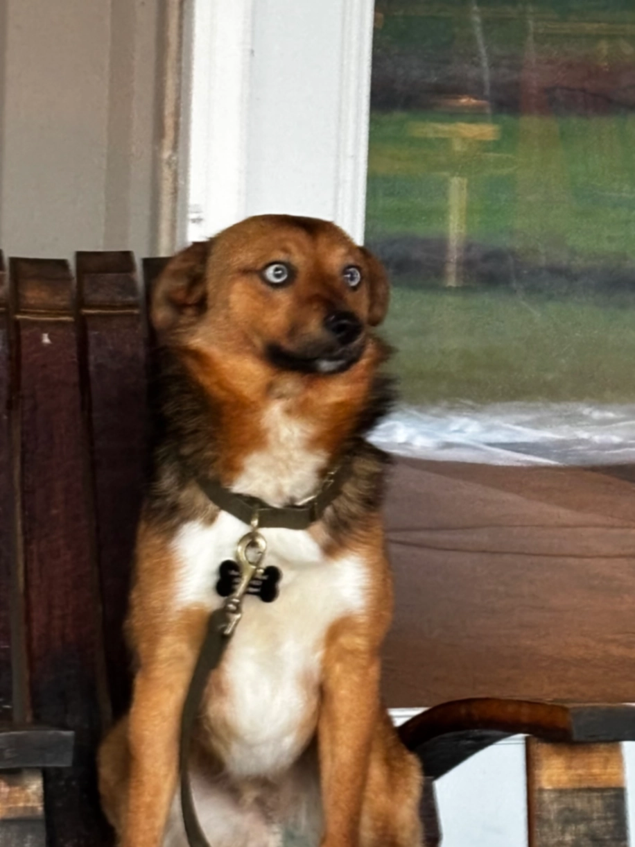 Young male, recently adopted from humane society after sad early life. Very sweet, but nervous and uncertain- friendly but skittish