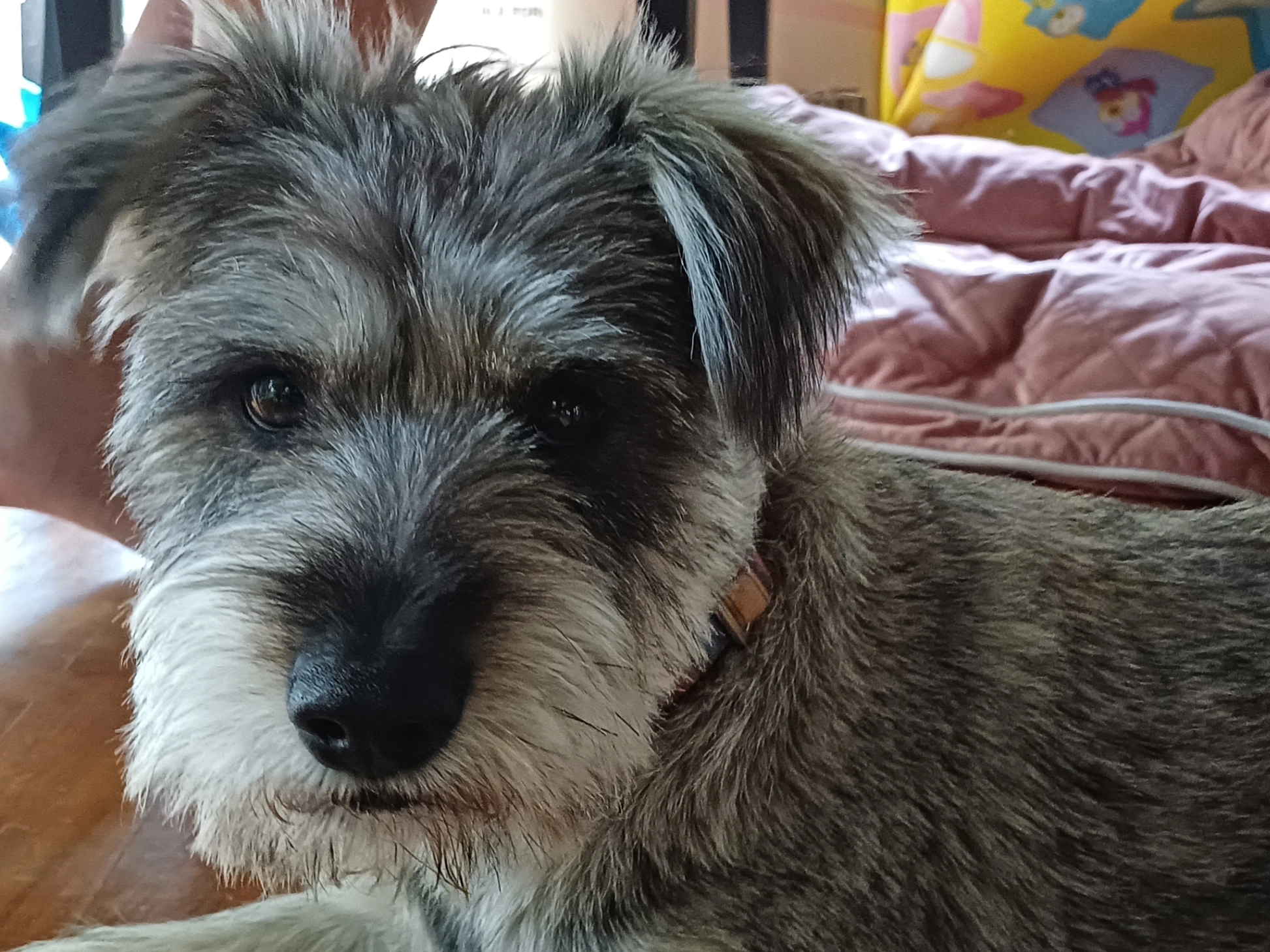 He is grey with a rainbow collar and purple tag. He is a fast runner and has black paws