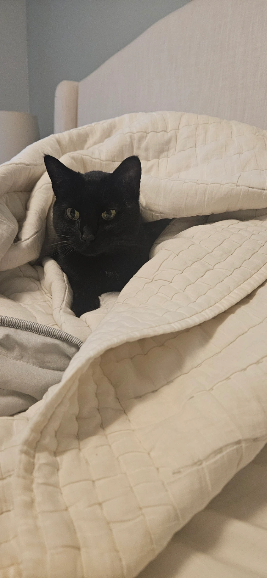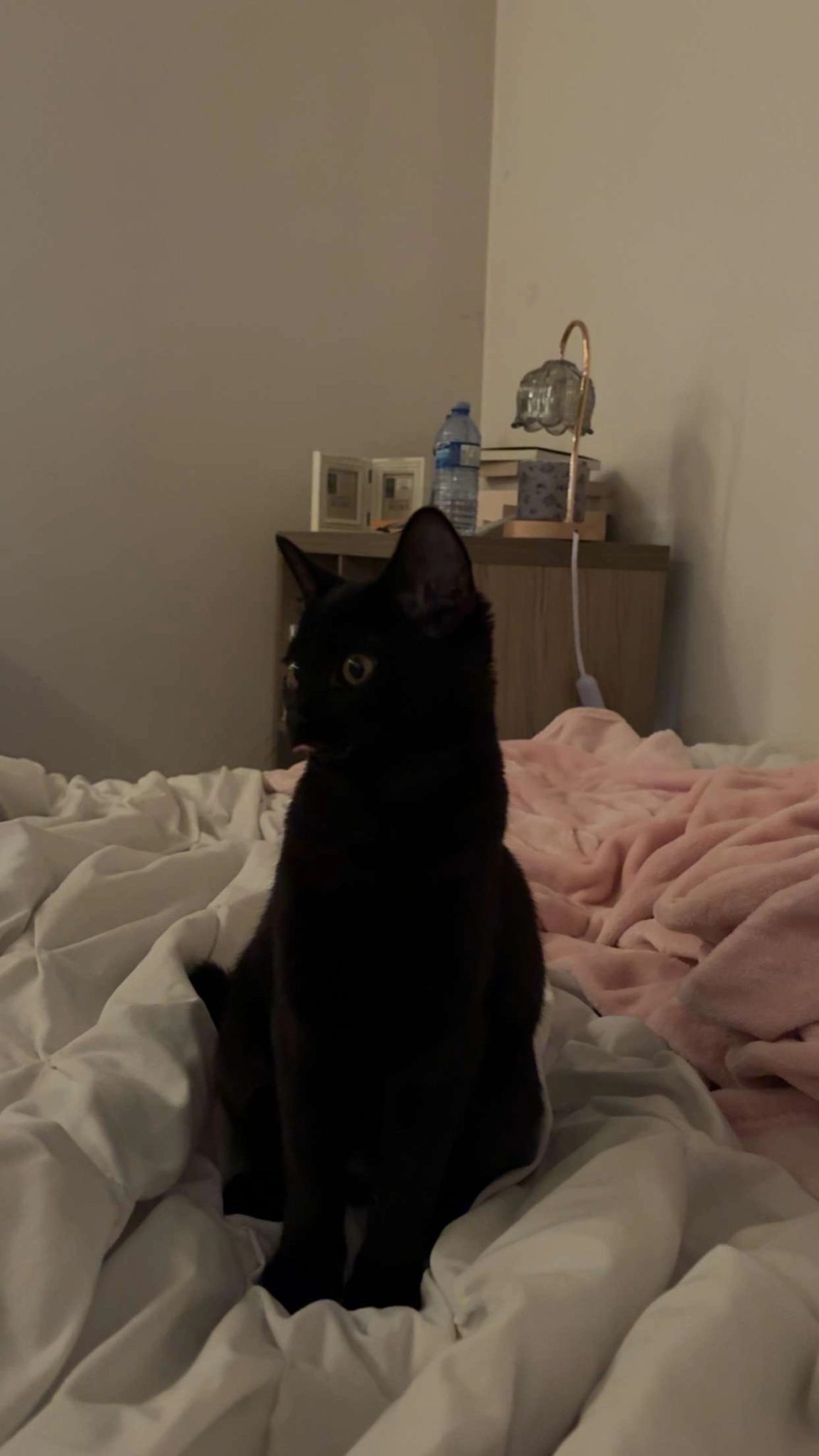 Very scared and timid. She's an inside cat and small. Small white patch on her neck