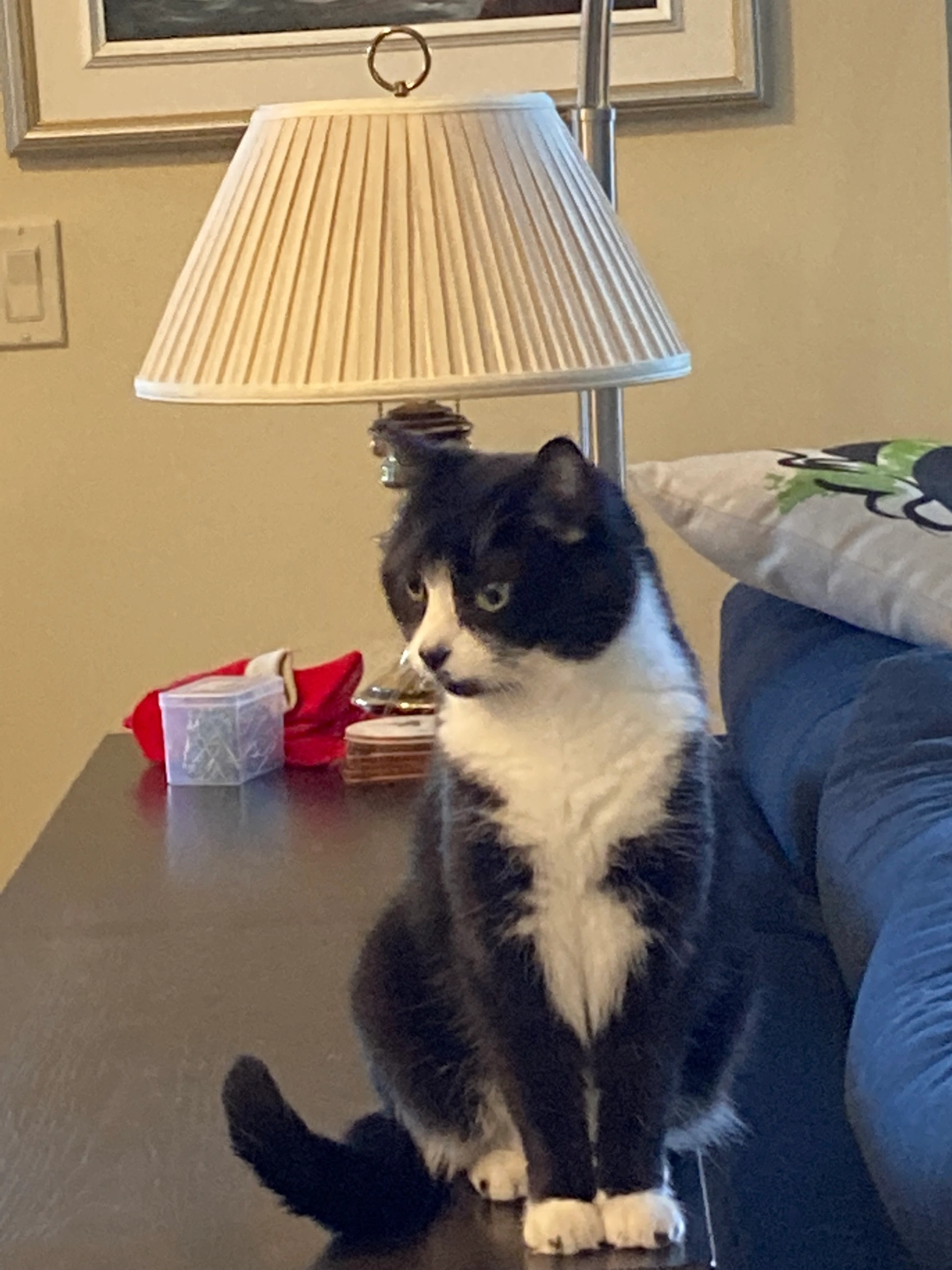 Small black and white female cat. 9 years old. The white extends high up her back legs. She currently has a tender left ear. She is very gentle, friendly and affectionate.