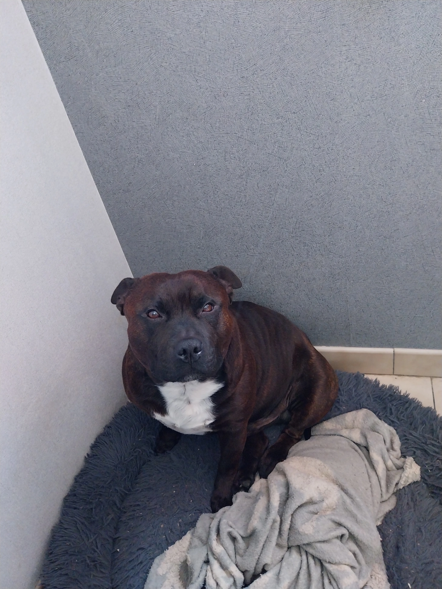 Elle a des poils blancs sur le cou, sur les pâtes et sur le ventre.