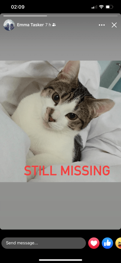 MillyReunited after12h, 38minWe knew the first 24 hours would be critical - we put in local groups and also pet radar. So glad we did! It worked, after 13 hours we have her safely home - from a neighbours garden 5 minutes away x thoroughly recommend