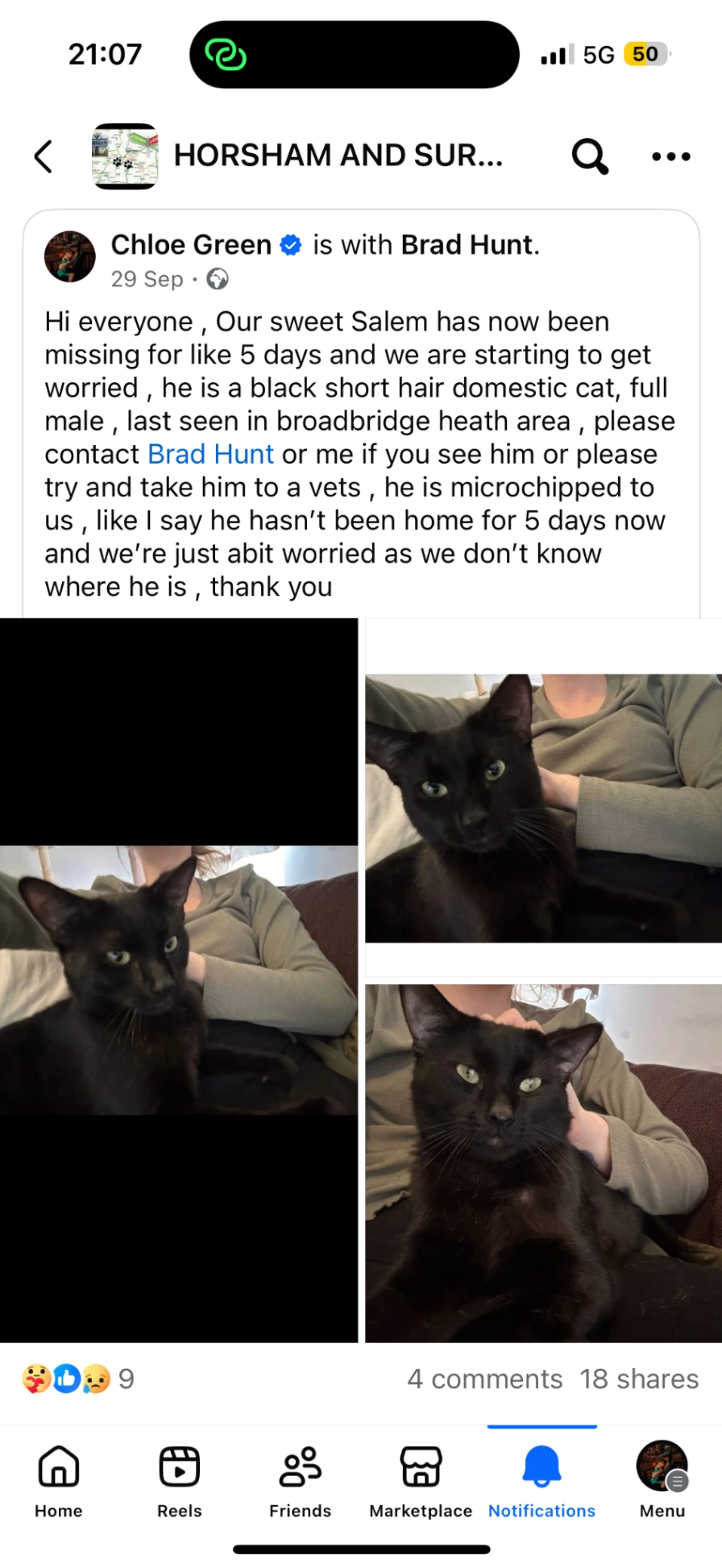 GeoffReunited after4d, 13hPetRadar found out cat! Thank you so much. He was missing for a week in December when it was really cold and we were incredibly worried. 1 week after he went missing, we got a comment on the petradar Instagram post that someone had found him over a mile from home. And we were reunited 😃 thank you!!