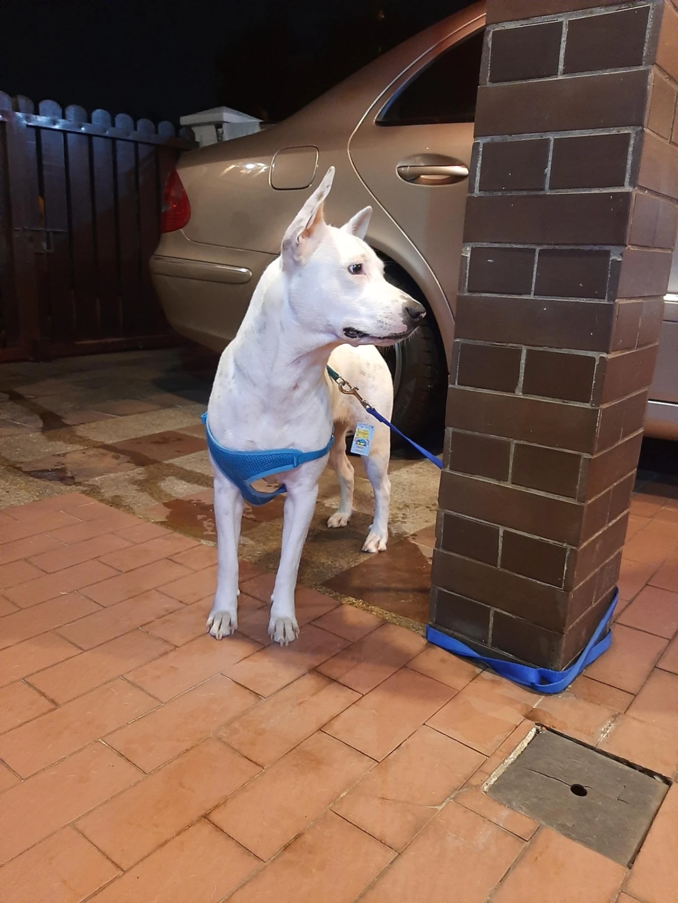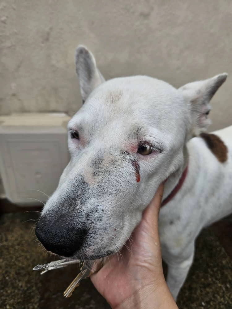 She has a wound on her nose area, she is white with a big brown patch on her back