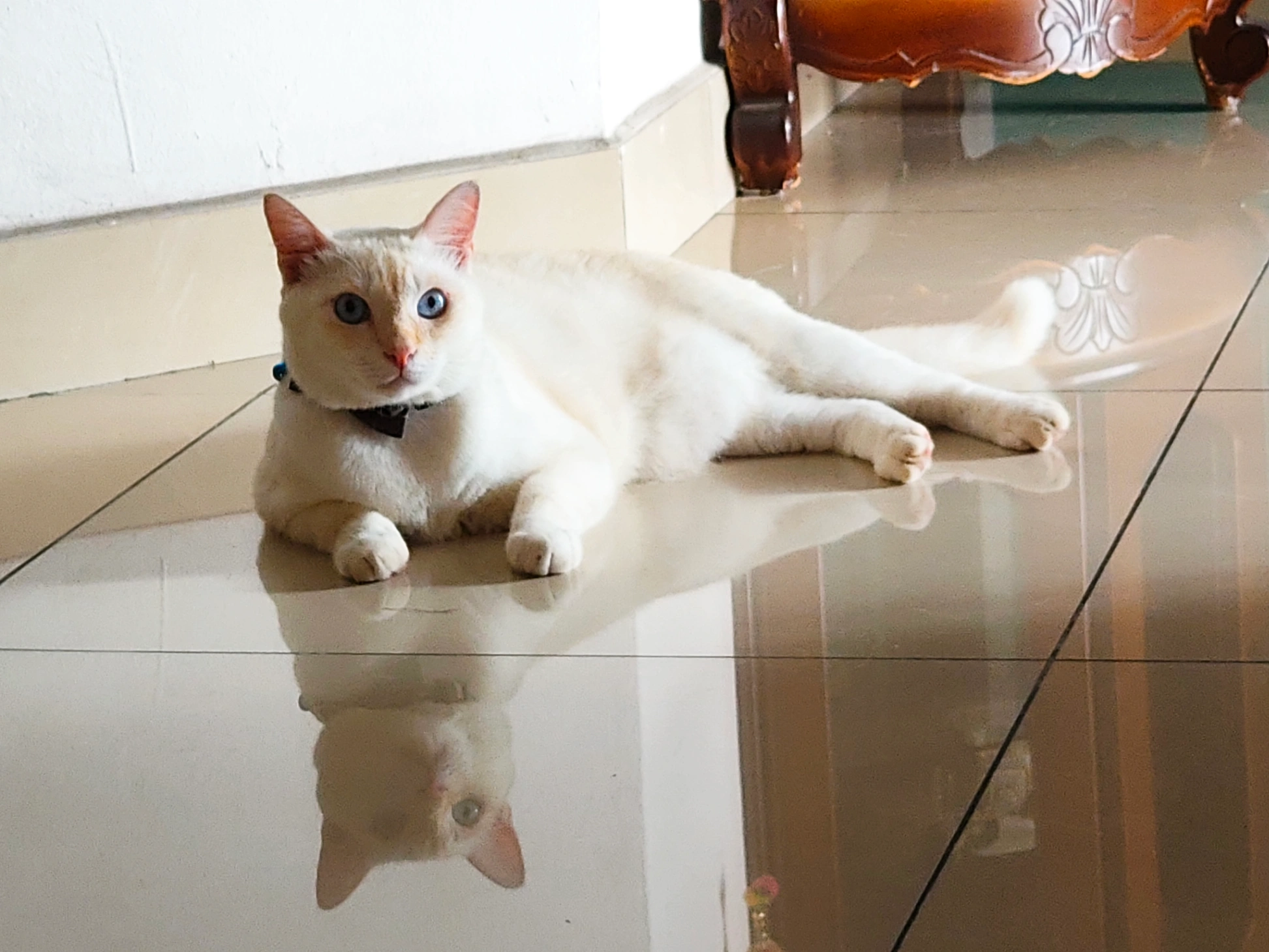 White with light brown shade. Blue eye coloured, he’s having flu currently. Wearing a yellow collar with bell.