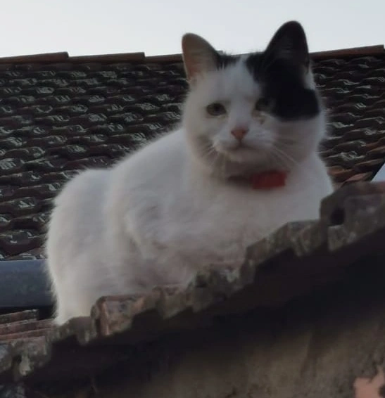 He has a bald spot on his tail, and wears a white-pink collar with a little bell.