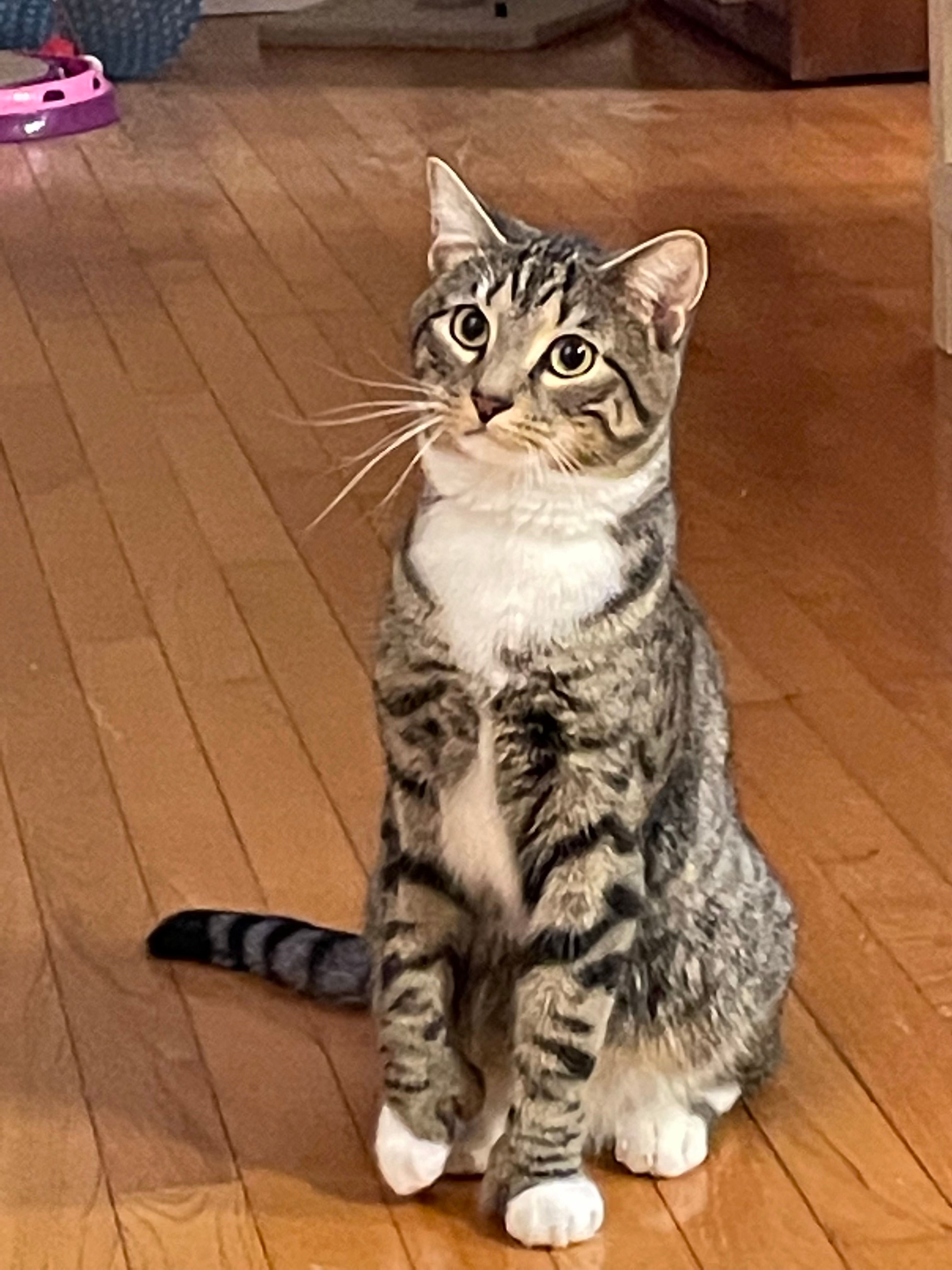 His name is Barsik, he is 2 years old, Tabby American Short hair, very shy. He is a polydactyl cat. He has white markings on his paws that look like white gloves. He is microchipped as well.