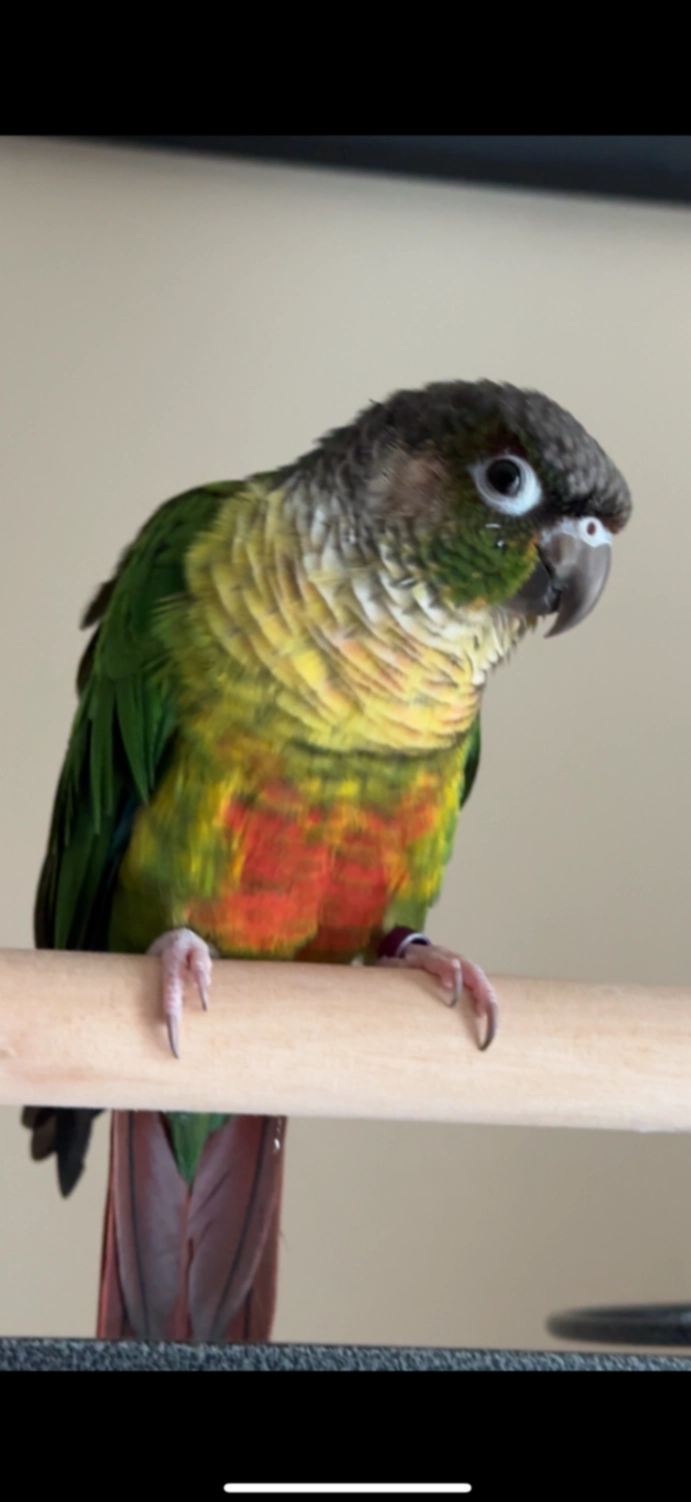 Birdie is a green cheek conure with a purple leg band on her left leg. Please help us find her!