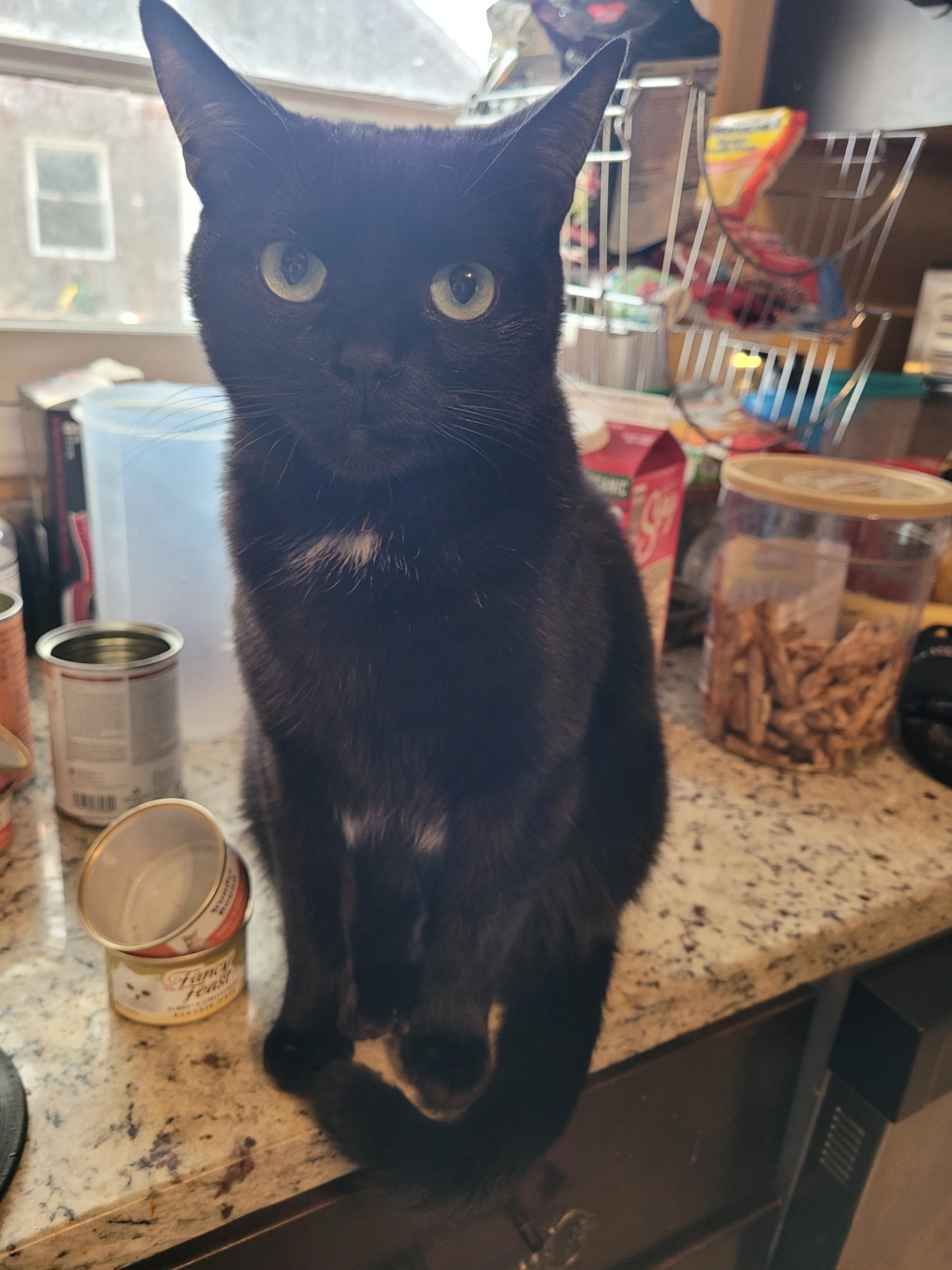 He's 4yr old neutered, microchiped and current on vaccines. He's mostly black but has little flecks of white on his back. Not really friendly, may let someone pet him but will bite or scratch if picked up. Food motivated.