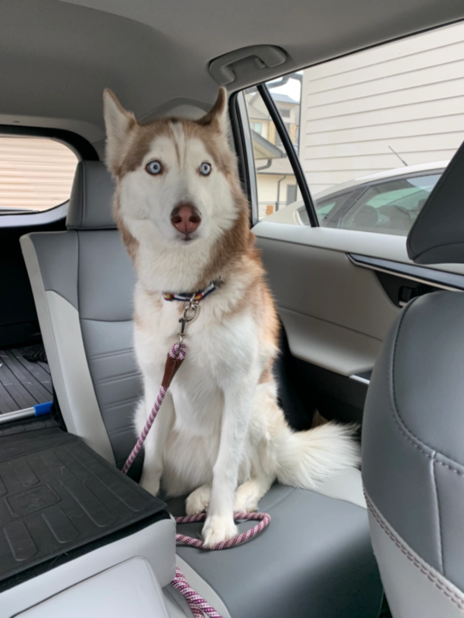 Copper tone husky. She is petite and has a pink collar on.