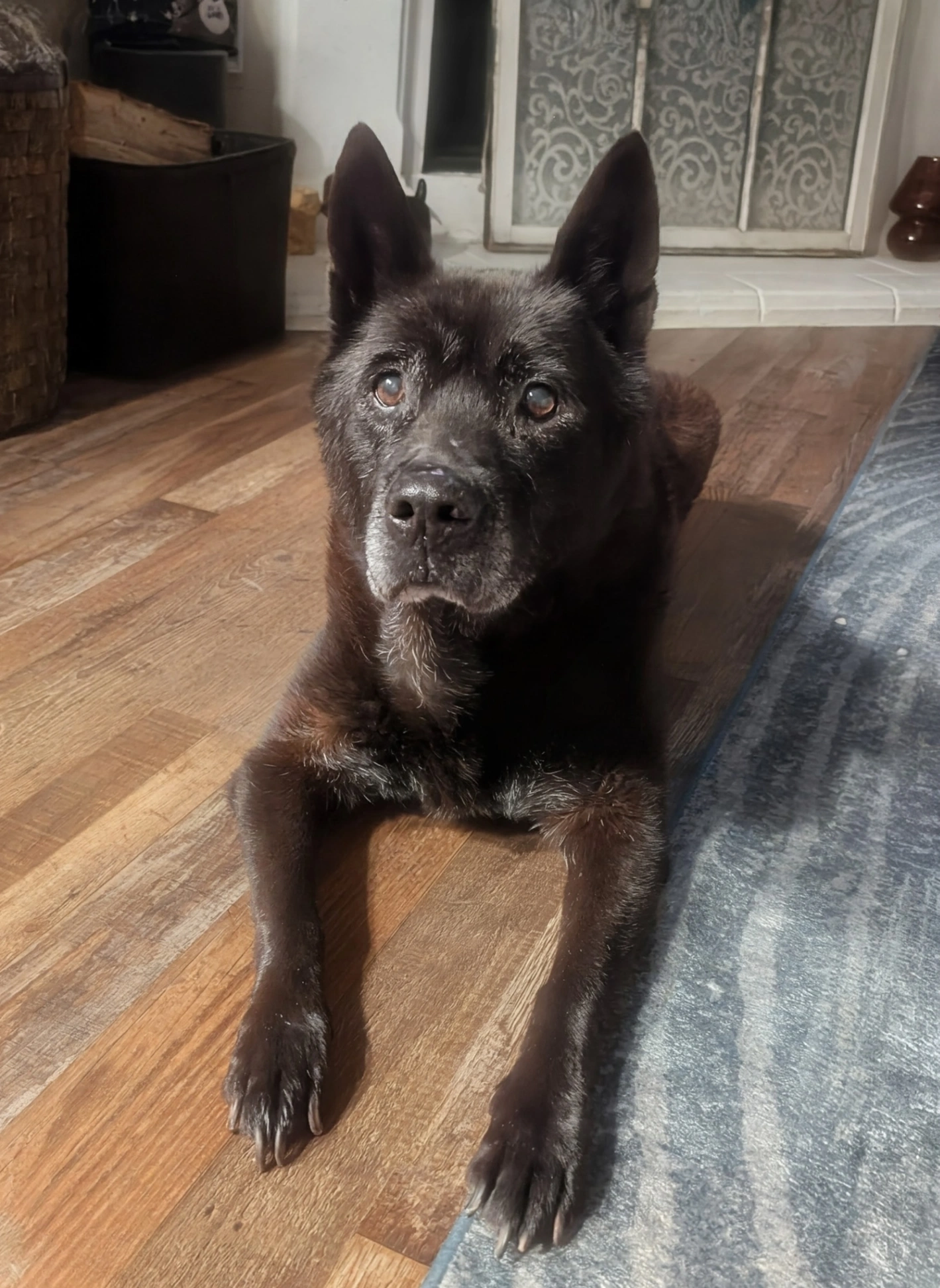 16 years old. Black . Shredding on back. Grey under chin area most. Has anxiety and can't hear well. Black skin tag on lip