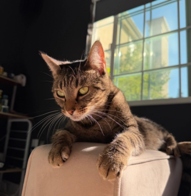 Buffy is a petite tortoiseshell with majority brown at a glance. She is about two years old. Green eyes. Black nose. She has a short tail. She is quiet and very skittish. She was rescued over a year ago, so she is familiar with the outside but hasn’t been out since then. She does not wear a collar but she is microchipped.