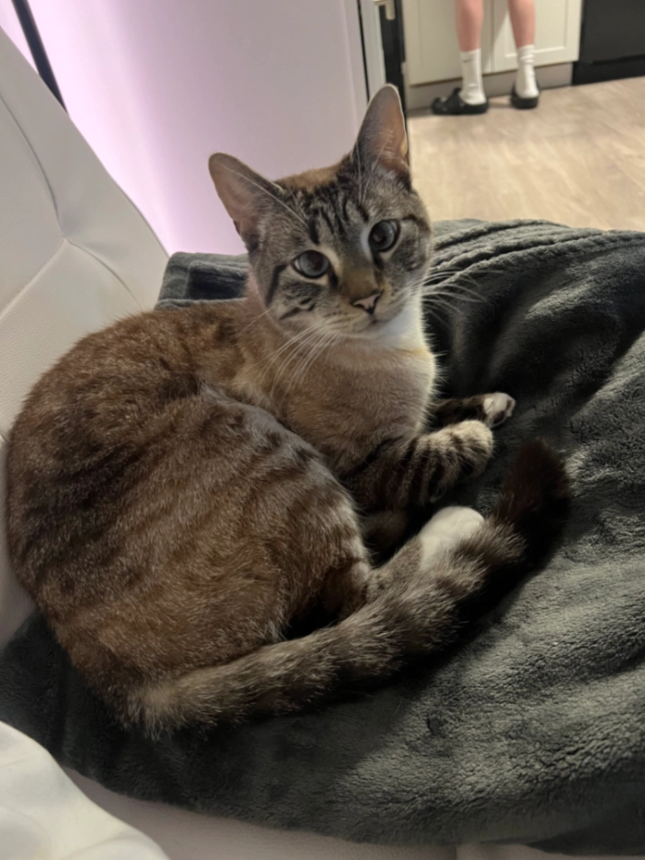 Dior is a 4 year neutered Lynx Point Siamese. he is grey/brown in coloring. he has bright blue distinct crossed eyes. He is quite friendly but can be skiddish.