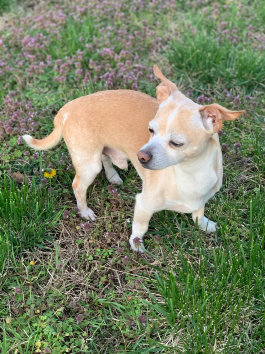 Tan/white color, timid, barks a lot, He’s anemic and narcoleptic.