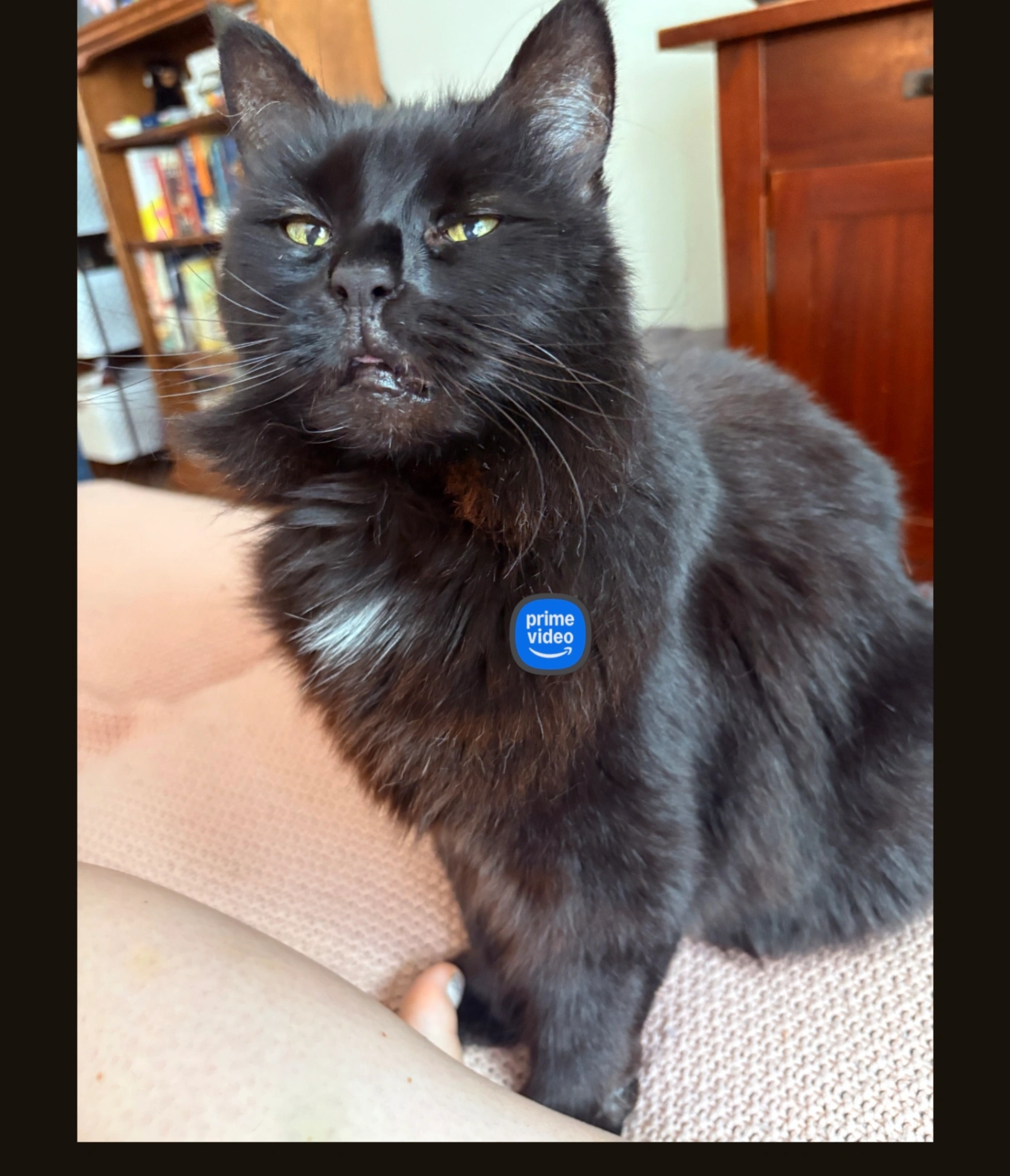 Moxie is a black Persian female cat yellow eyes and a white tough on her chest. She is 13 years old and slipped out of her new house on moving day . She has no idea where she is and his friendly but probably very scared