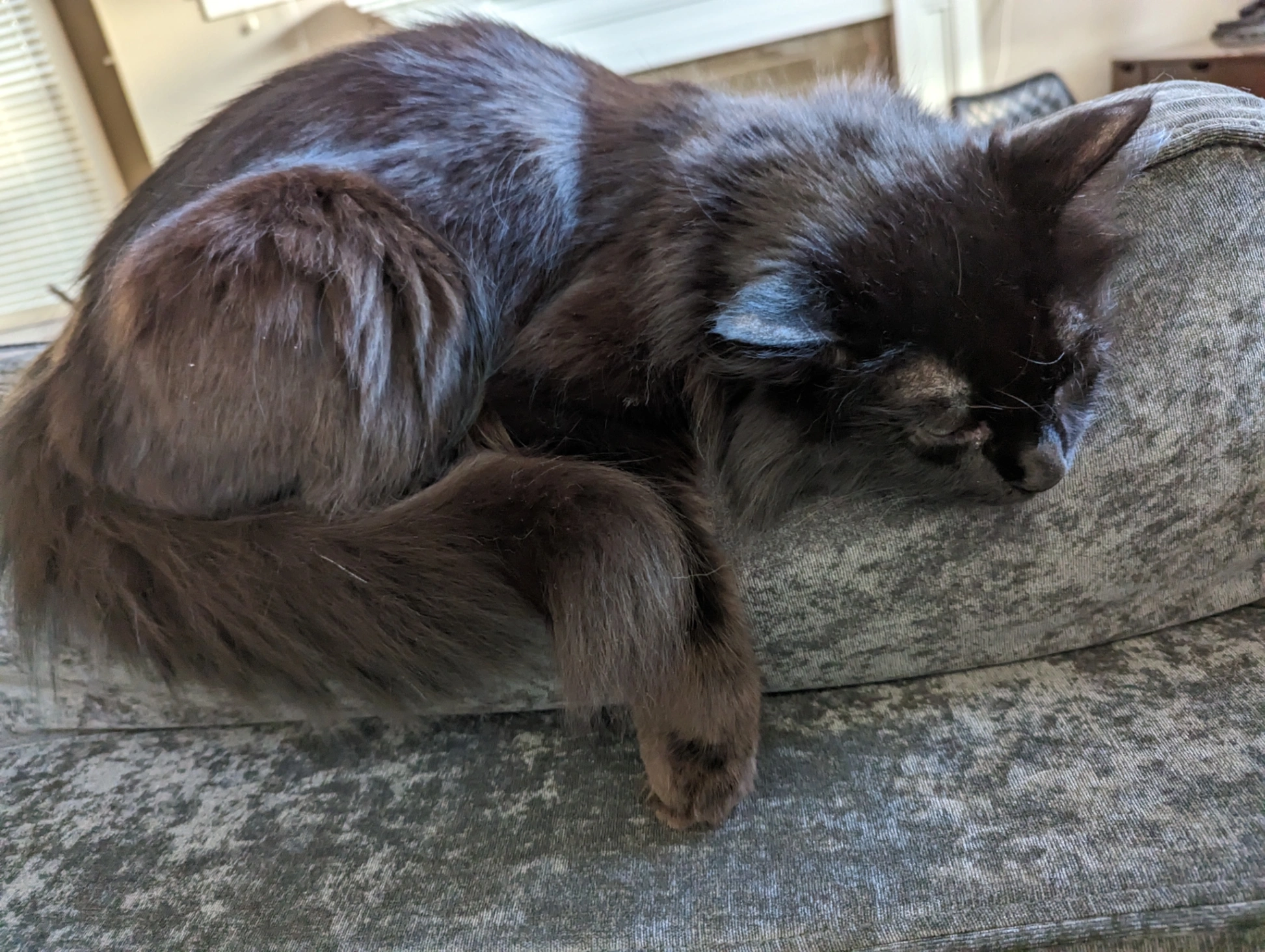 Harley is a curious one, especially when it comes to exploring garages or back decks. She has a marking like a triangle that goes from one side of her eye to the other.