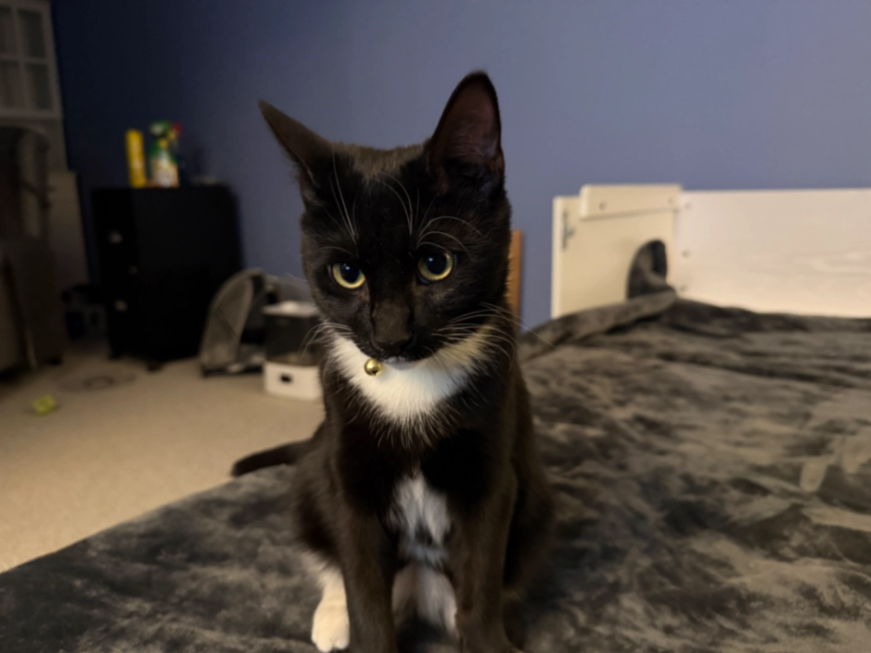 He is a gray tabby cat with a limp on his right leg and his tail makes a C and it touches his body. He has a raccoon type tail