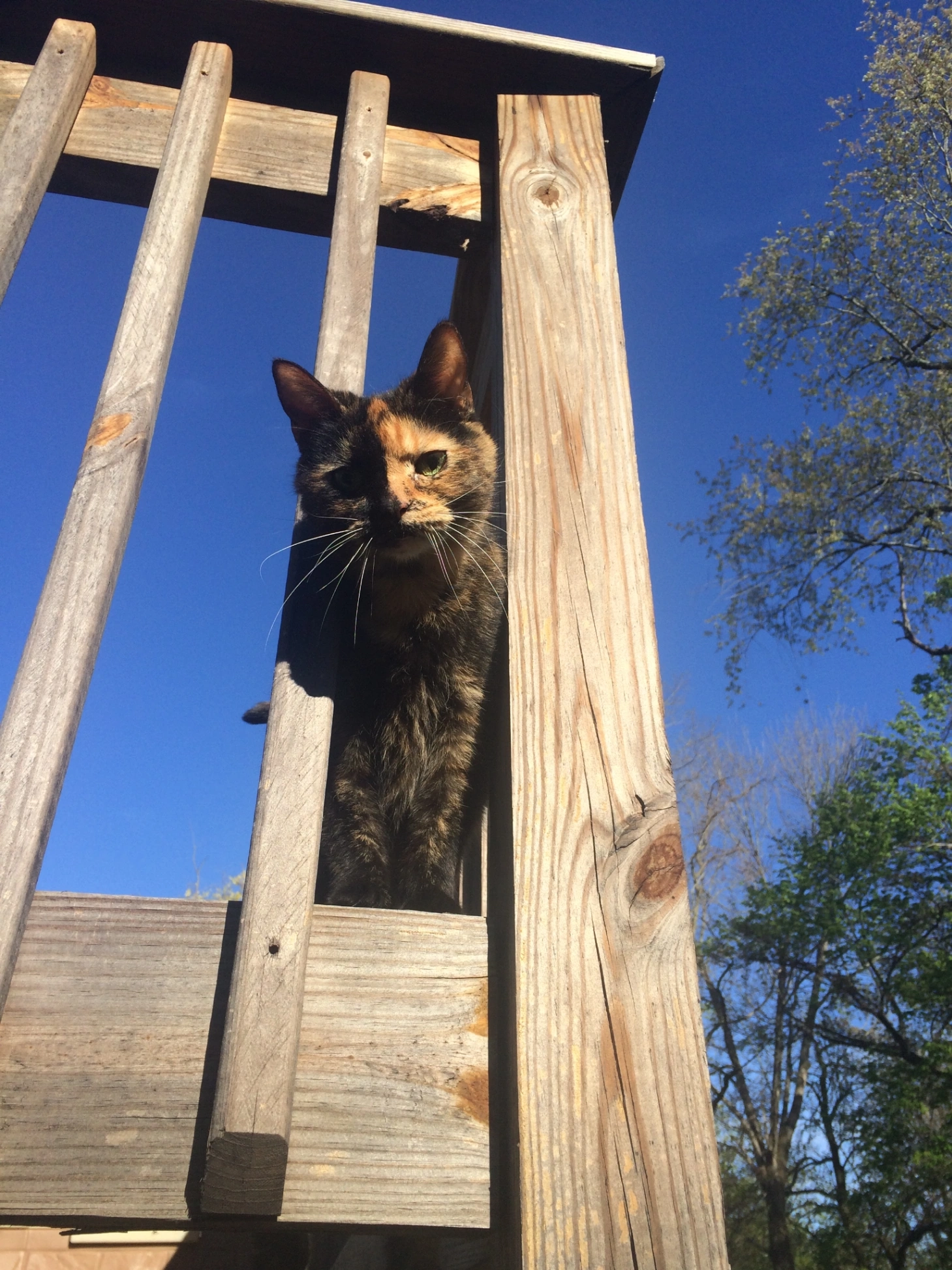 Ruffled belly fur. Green eyes. Dark tortoiseshell cat.