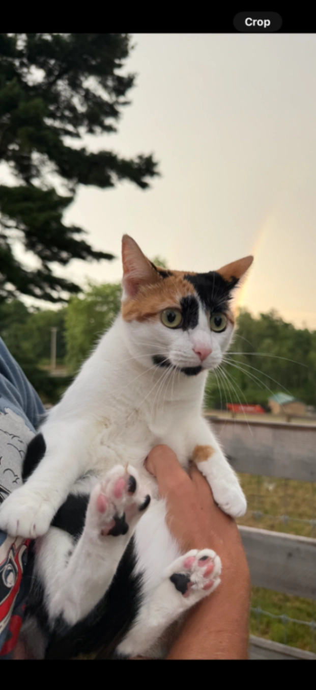 Female calico with mostly white, black and orange fur, 2 years old and shy.