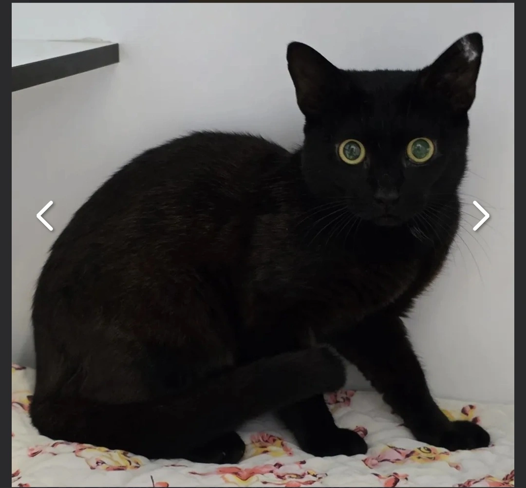 Small cat, only 10months old. He is all black with a small tuft of white fur in his left ear from desexing. He has some white furs on his upper back/shoulders (just a small patch, splattered not a patch of fur). Big yellow eyes. Just under 3kg.