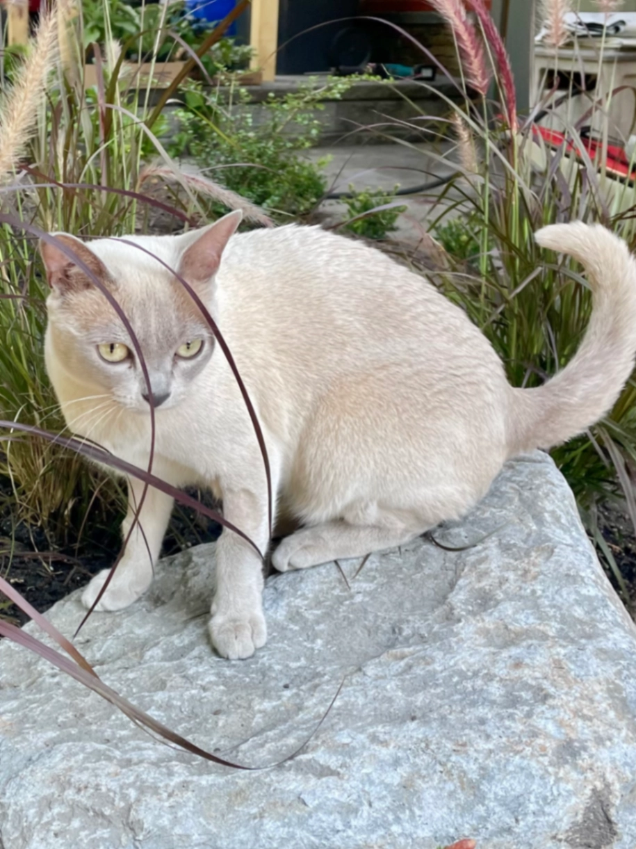 Small grey-white Burmese with green eyes. Skittish but very vocal - knows her name and loves the treat packet.