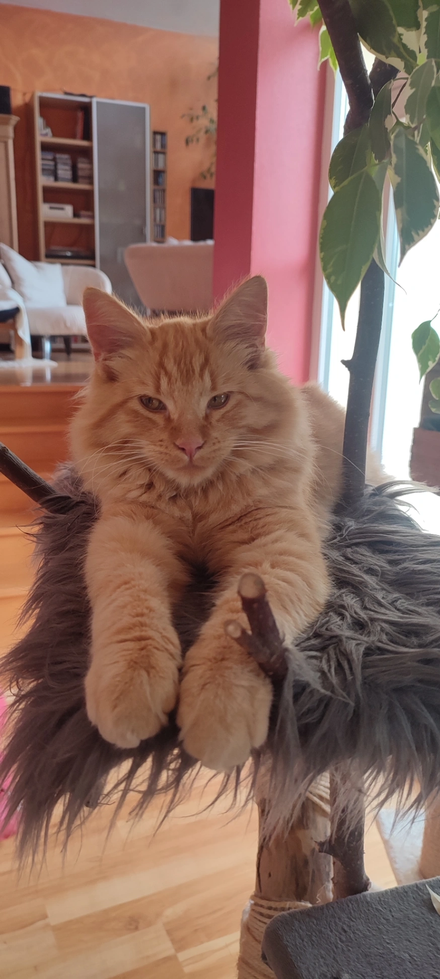 Kasimir ist ein rot getigerter Kater mit durchdringlichen Blick. Er hat einen buschigen Schwanz mit einer weißen Spitze und am Hals längeres Fell, wie ein kleiner Löwe
