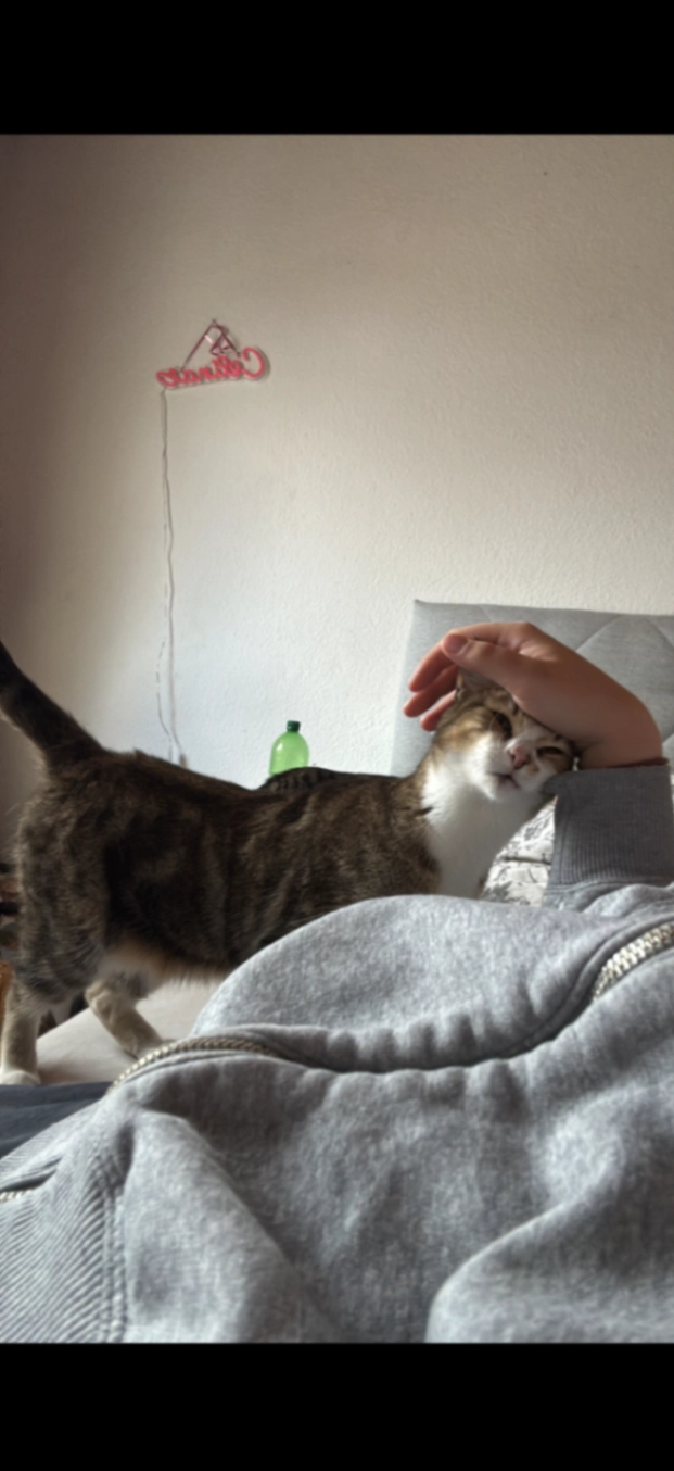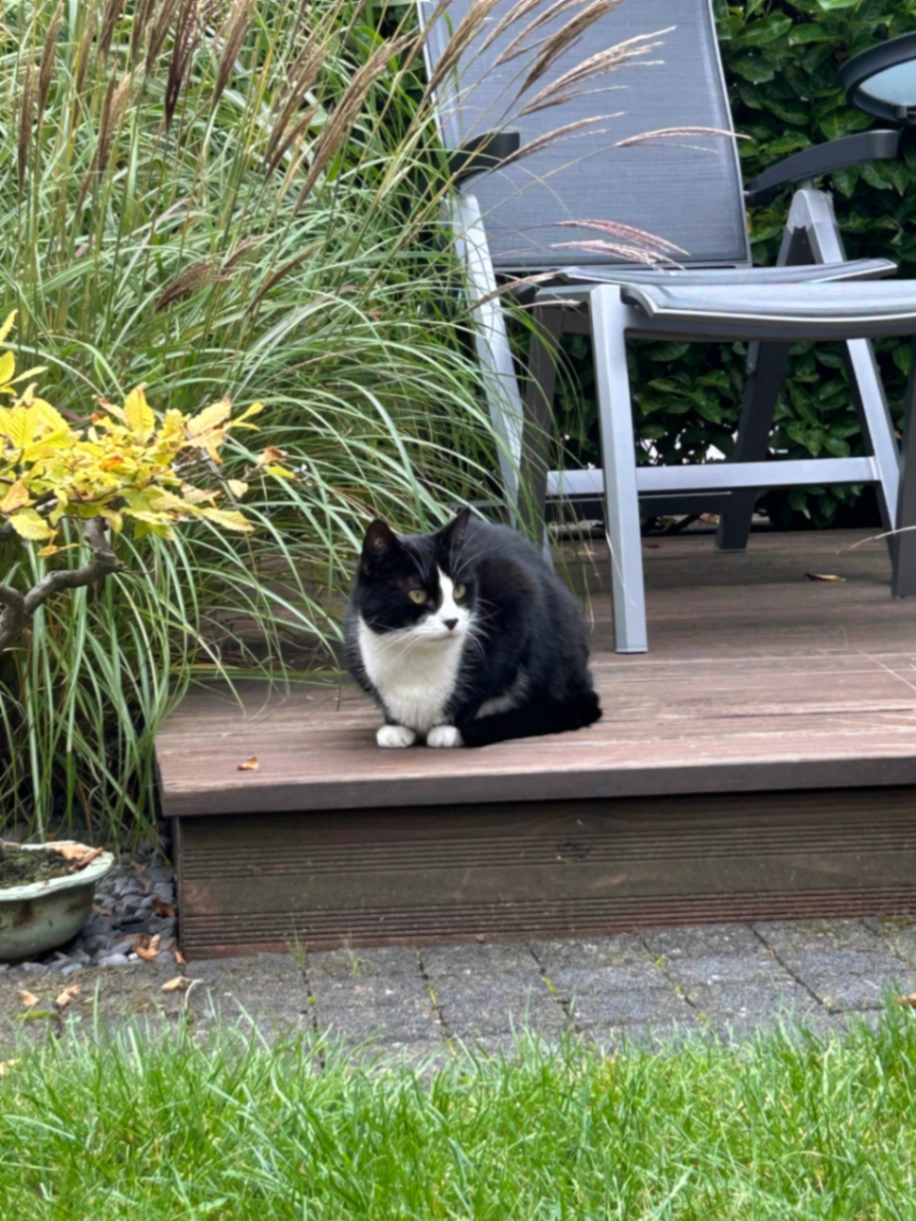 Sie ist getiegert braun und ist an der Brust weiß. Sie ist sehr schüchtern und lässt sich in der Regel nicht anfassen. Sie ist sterilisiert.