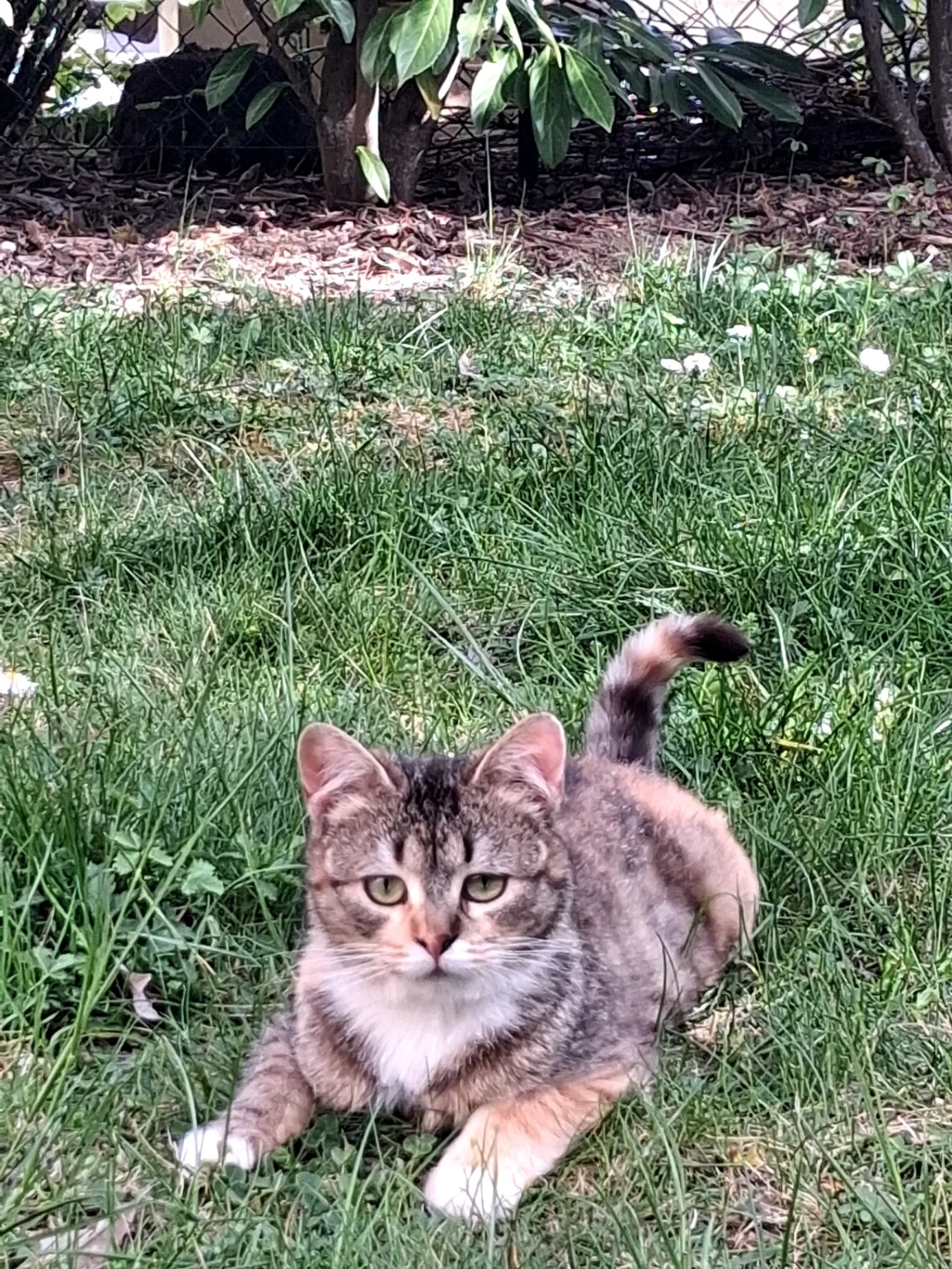 Petite chatte de 9 mois, tachetée, pas timide, du roux sur la patte avant