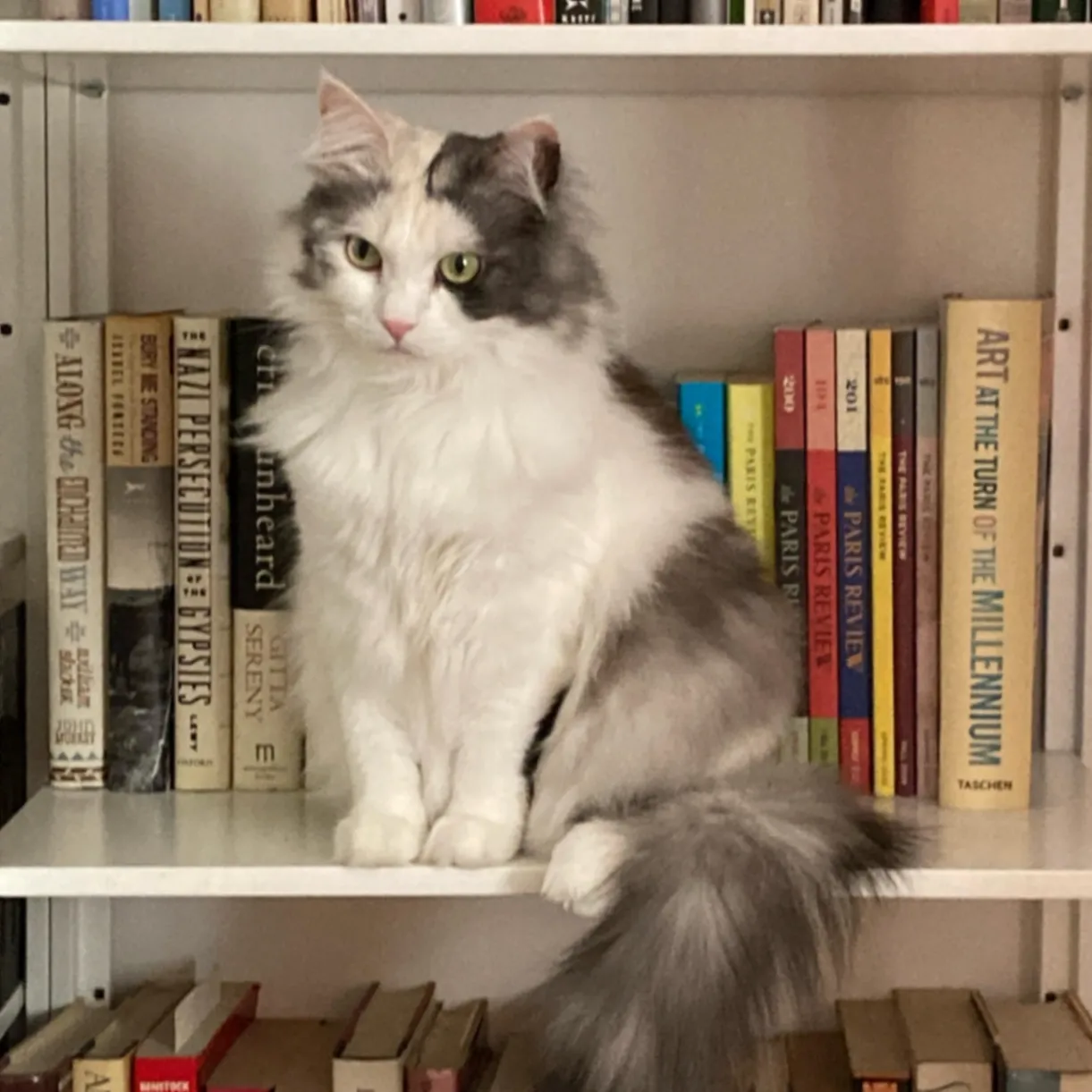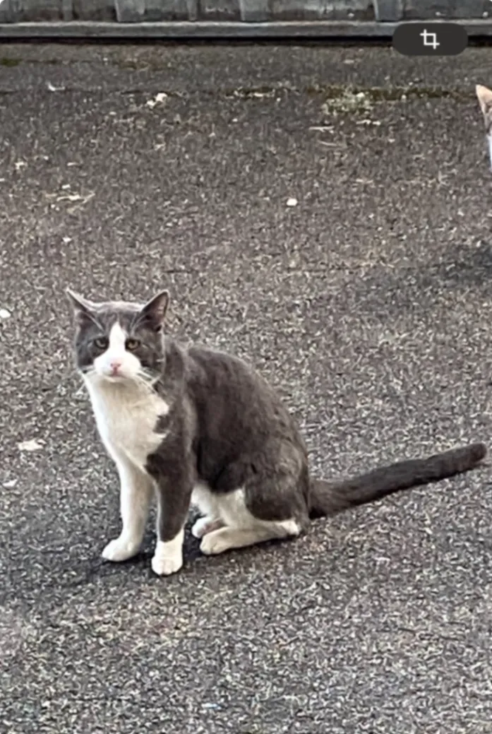 Musclé, gris et blanc, yeux vert, peut être très craintif mais mise en confiance peut être très sociable, miaule généralement beaucoup