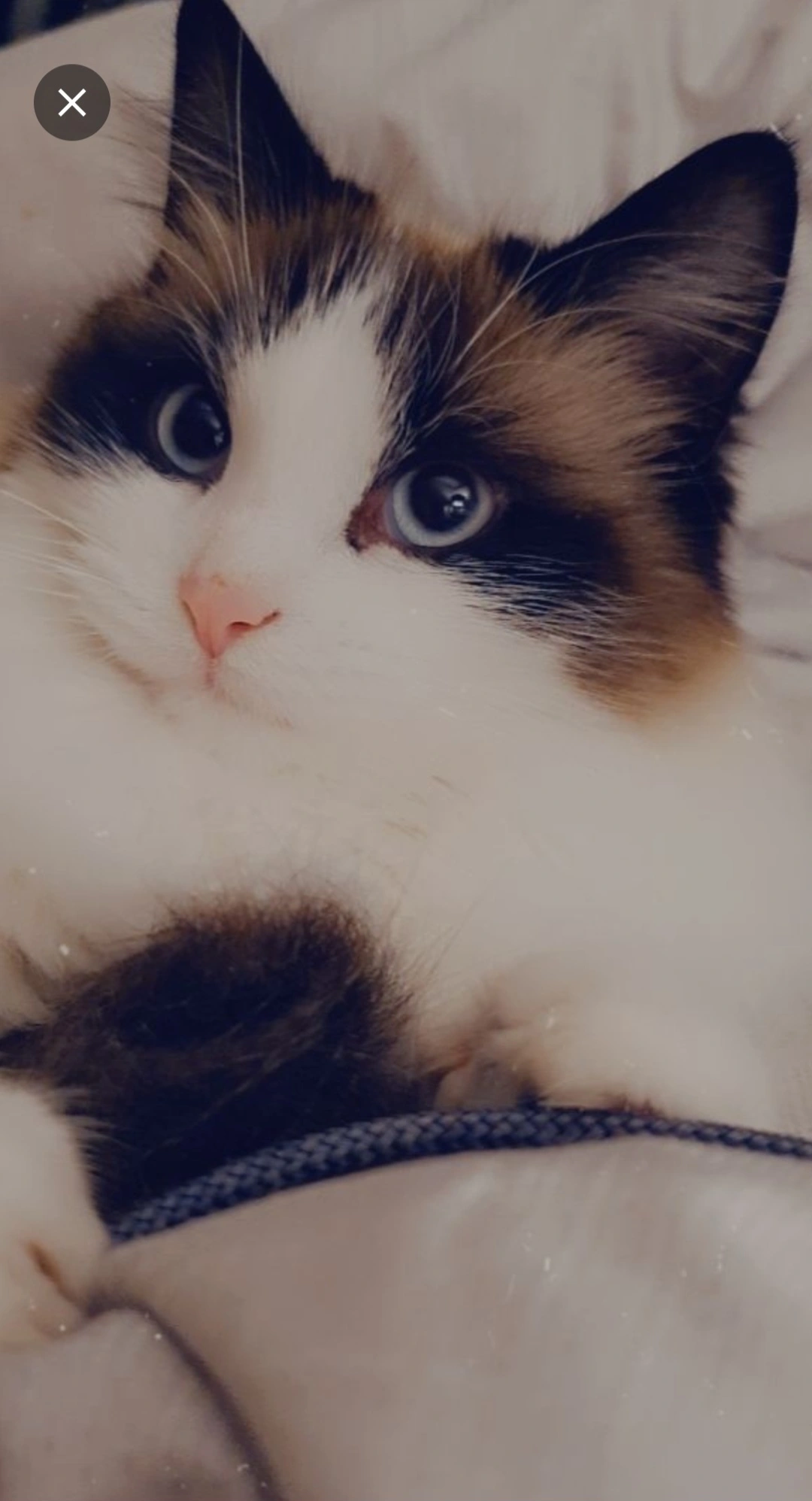 She is long haired with blue eyes and looks similar to a rag doll breed cat.