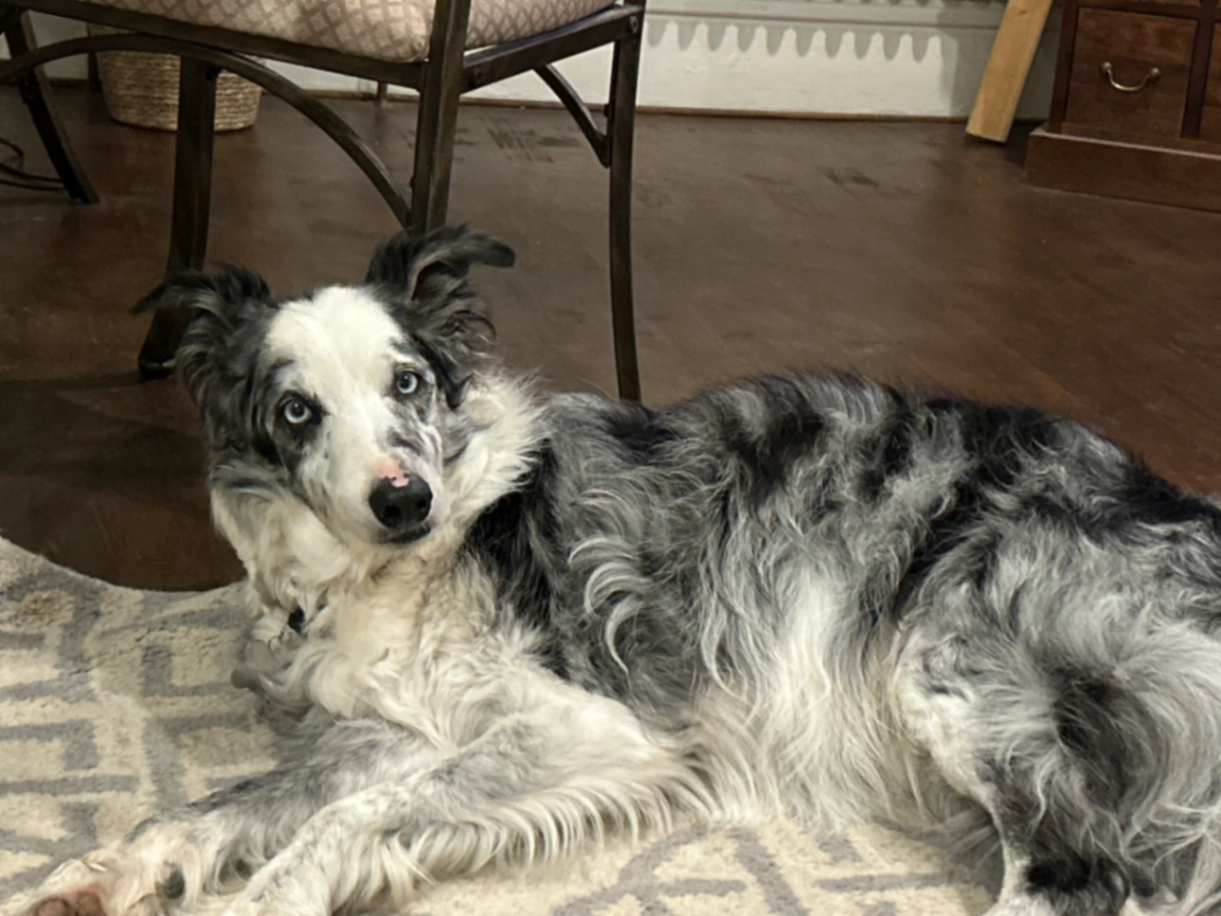 Border collie with blue eyes, grey and white fur. He is 15 so very docile.