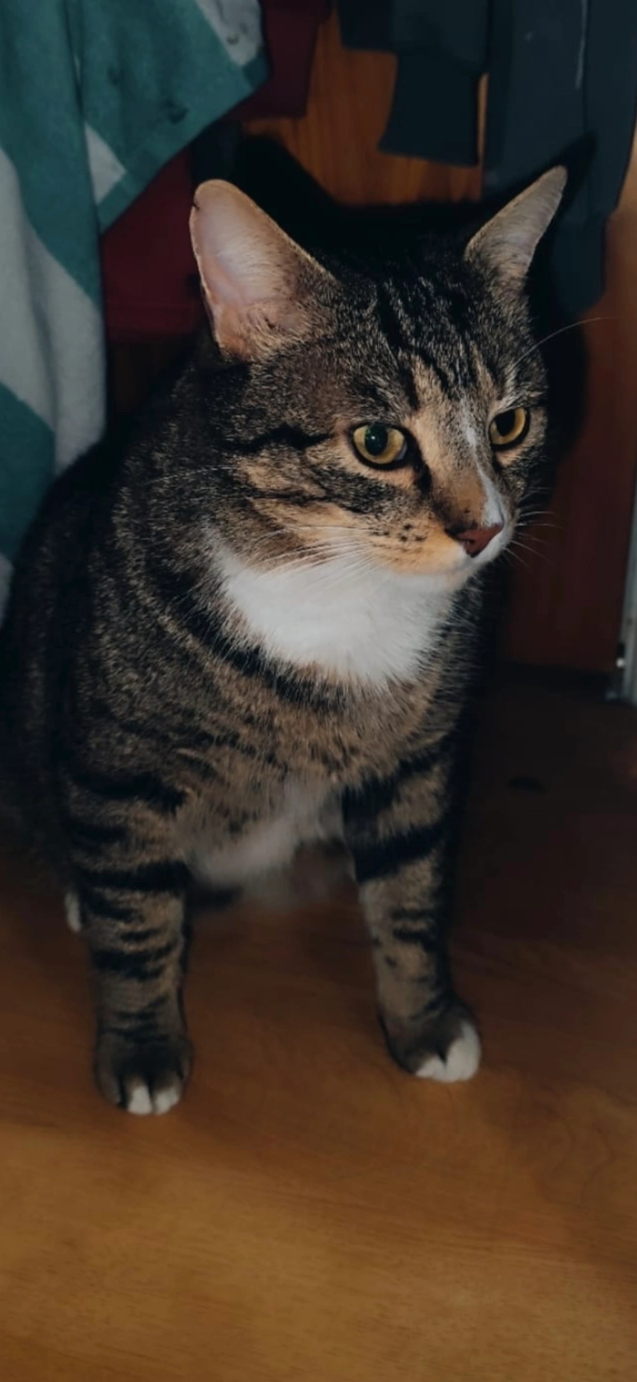 Beau is a 5 year old, large, male tabby cat, with green eyes. He is a very friendly boy but will be very scared right now.