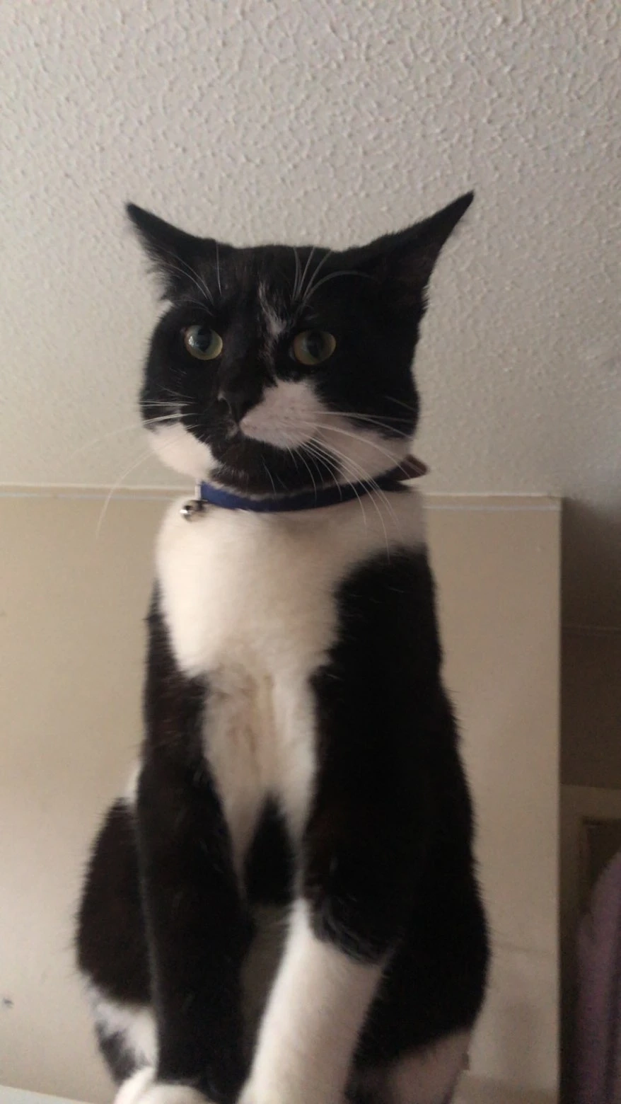 He's 8 months old and wearing a bright yellow collar with a bell