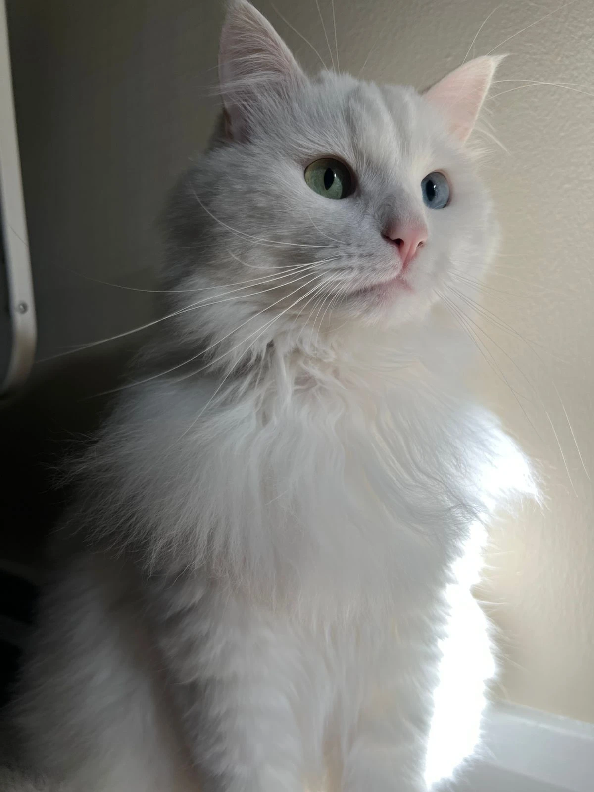 He is completely snow white with one green and one blue eye. He was last seen running away into the bushes at the bottom of The Mount near Wodeland Avenue.