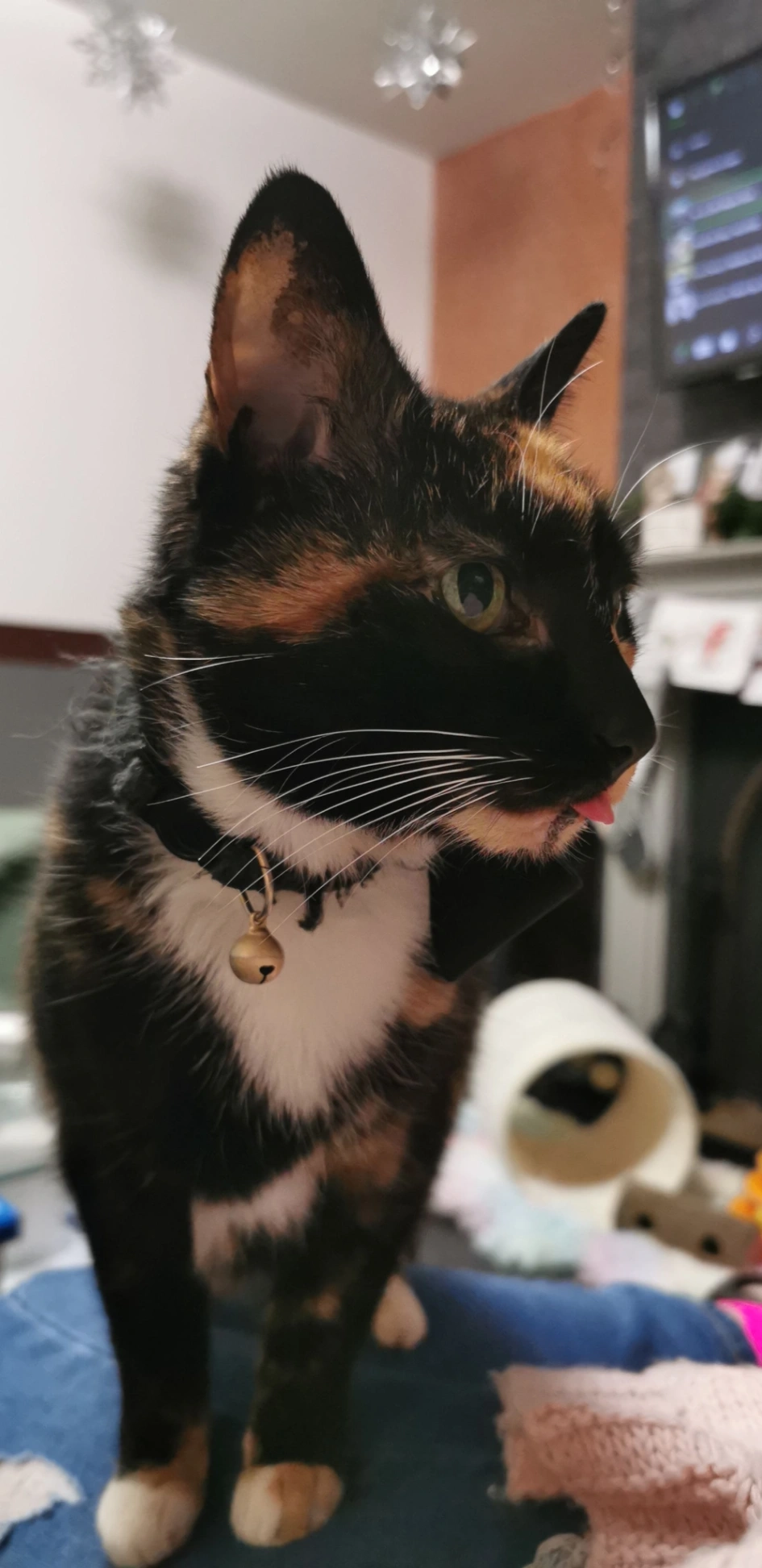 He is wearing a dark blue velvet collar with his name engraved on the clasp.
