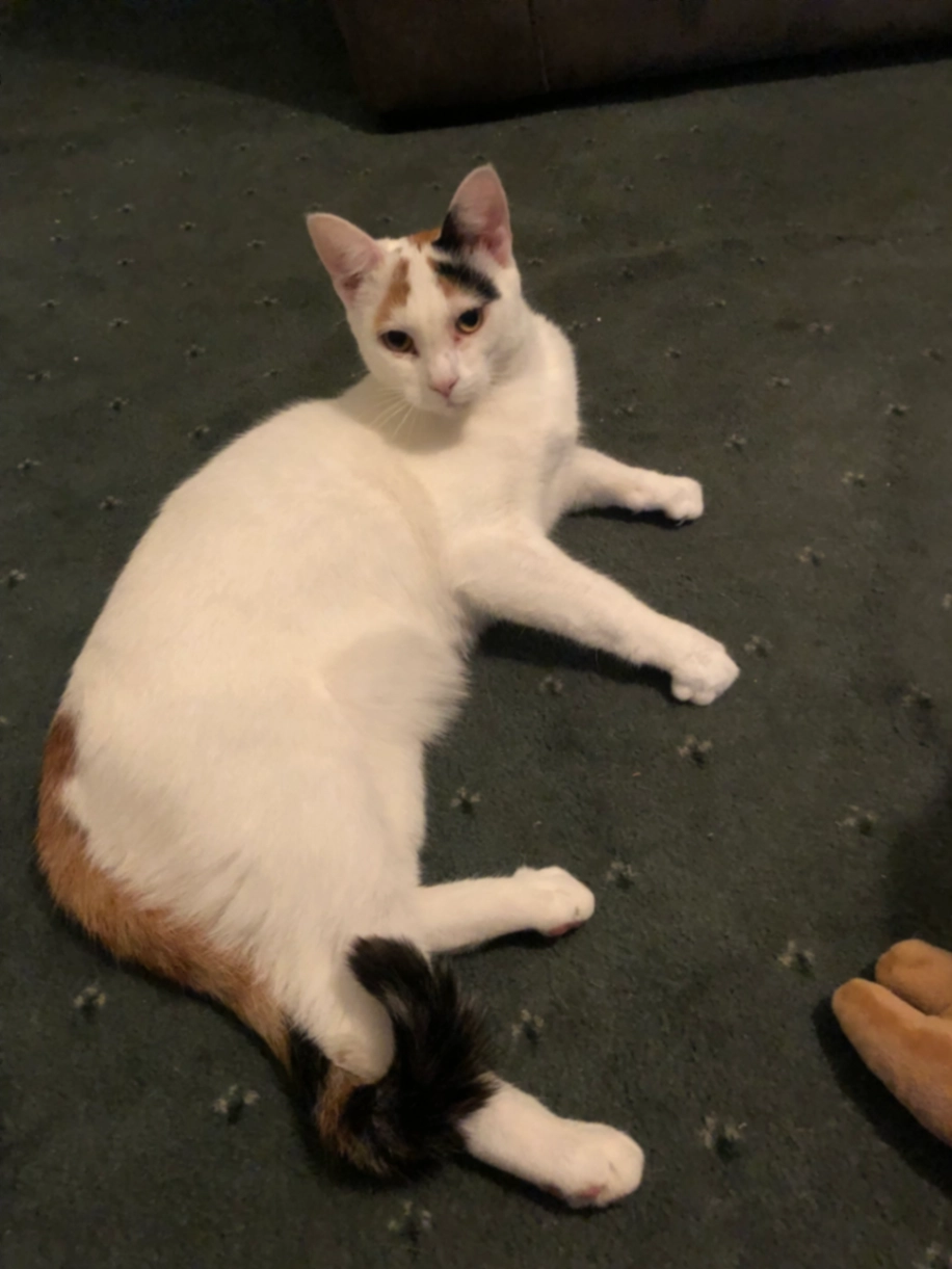 Joy is white with a ginger tail and has brown and black markings on her head she is also quite small