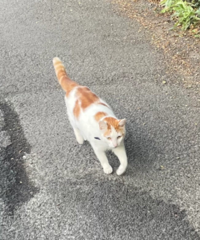 White and ginger fluffy cat, very friendly. Can be known to enter peoples houses.