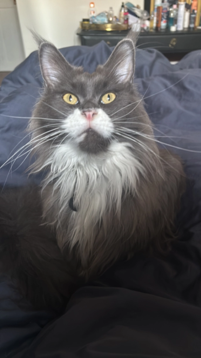Daphne is a large grey maine coon with long whiskers and a white mouth and paws. She is fluffy and very friendly. Our daughters miss her terribly.