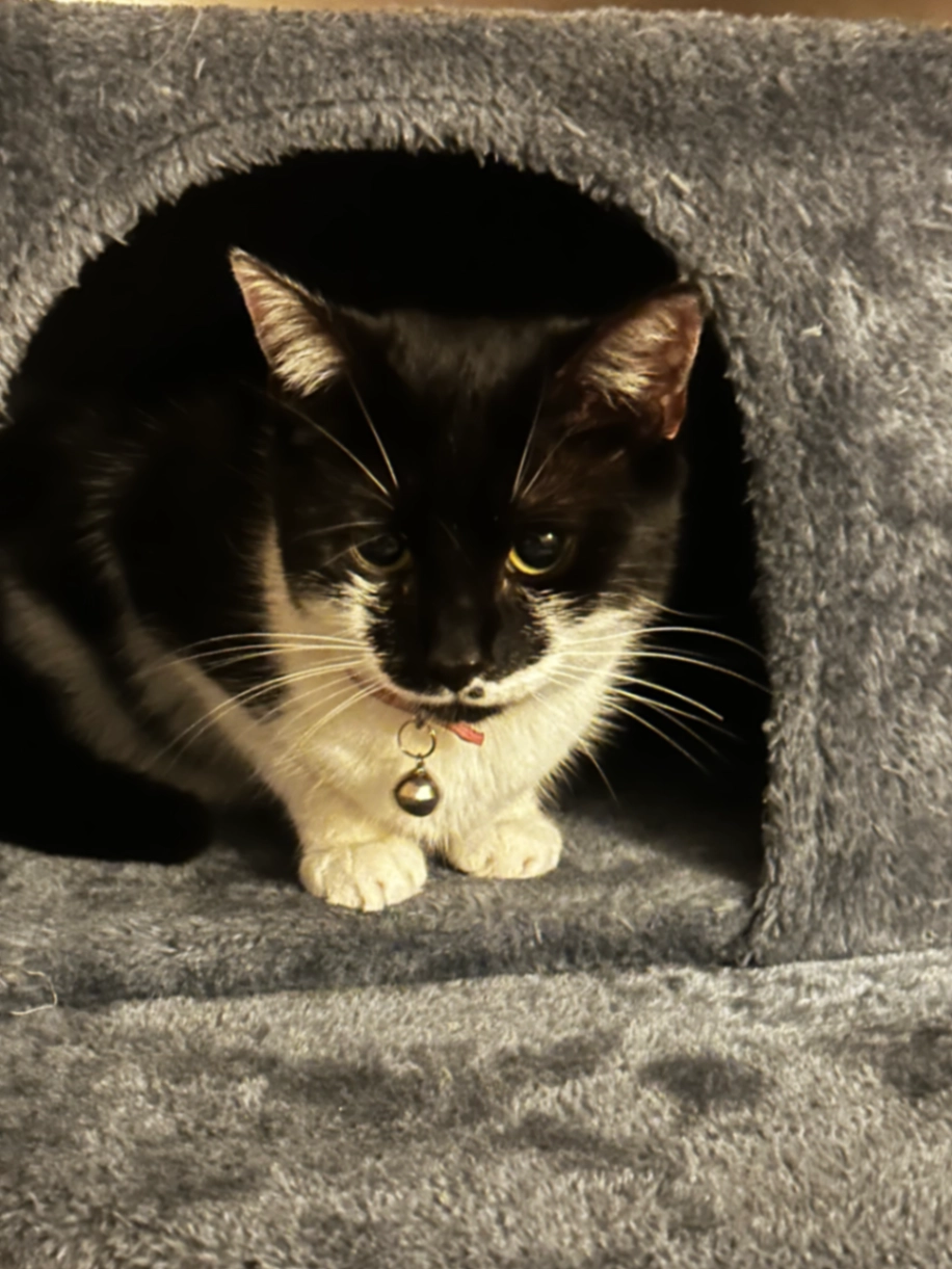 Black and white tuxedo, has a pink collar and black mole like spot on upper lip