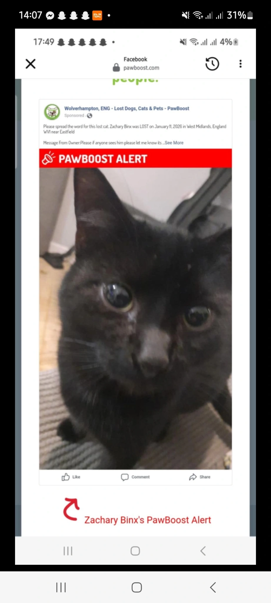 GeoffReunited after4d, 13hPetRadar found out cat! Thank you so much. He was missing for a week in December when it was really cold and we were incredibly worried. 1 week after he went missing, we got a comment on the petradar Instagram post that someone had found him over a mile from home. And we were reunited 😃 thank you!!