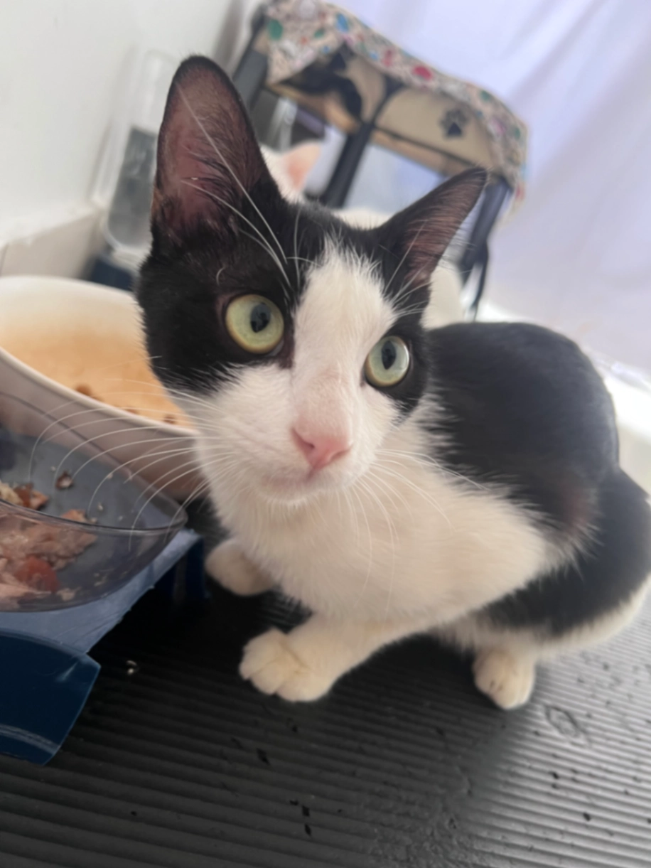 Felix is a male black and white domestic short hair cat, medium size, with a black head, black back and tail, and white underbelly and legs. He has a distinctive white nose and bright yellow green eyes.
