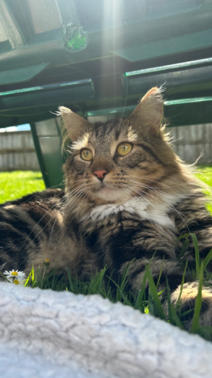 Chicken is a longhaired tabby cat & is quite a shy but extremely loving cat, he knows his name so will usually come to anybody if they say his name in a baby voice.