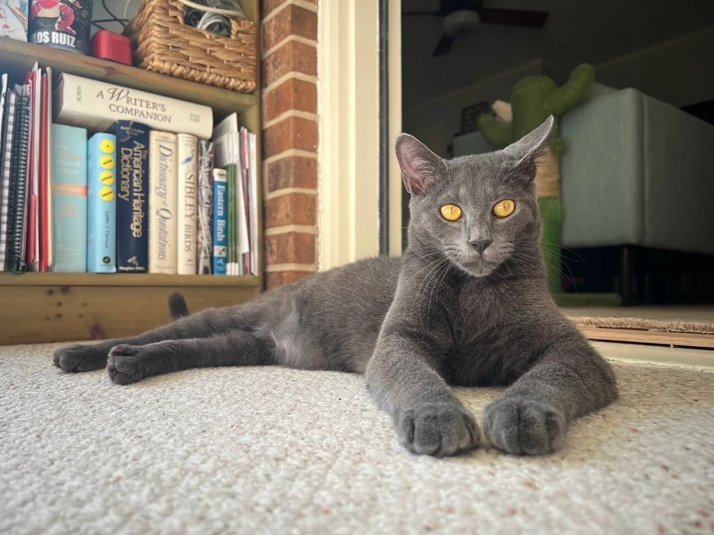 Male cat, gray coat, golden eyes. 10 months old but almost full grown. Long legs and long tail. Very scared to be outside. Indoor only. He has a microchip.