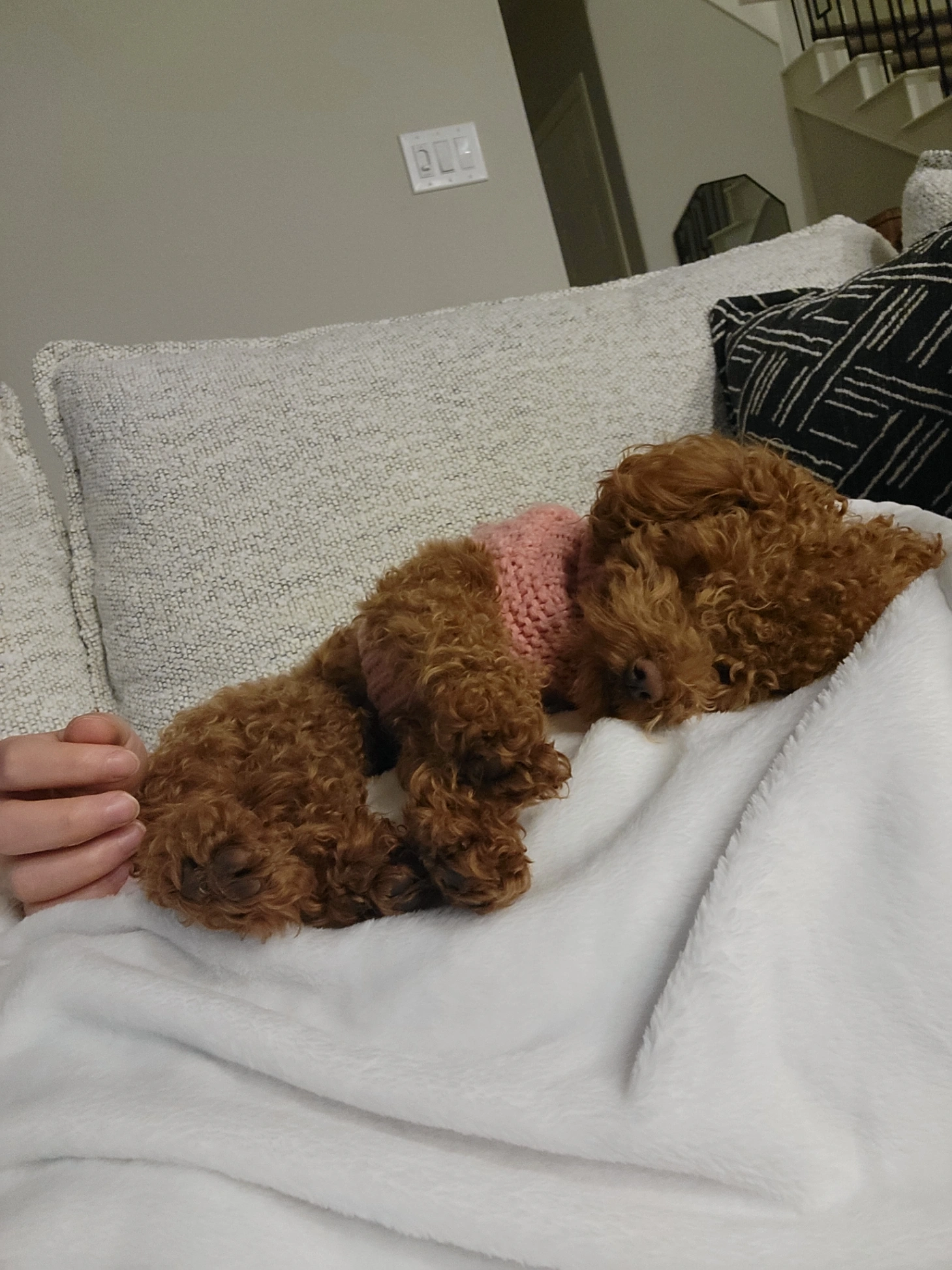 Small 5lb, brown, toy poodle. Loves to bark. Her name is cookie so maybe she will come to you if you call out her name. She's harmless, though she likes to bark at other dogs and act tough.
