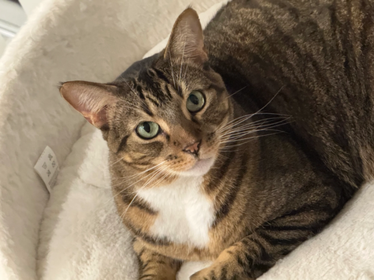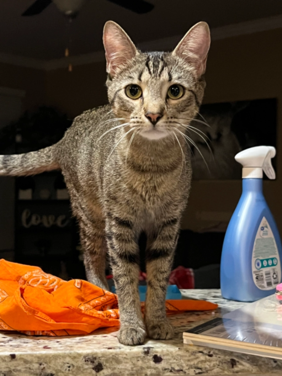 Small, grey and black speckled tabby with a white chin and long whiskers