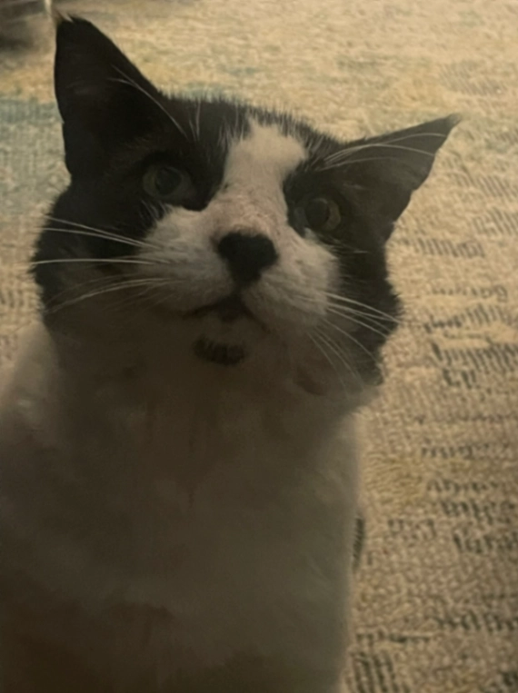Black and white adult male cat, not fixed, green eyes, black nose, black dot on chin. Friendly but probably scared.