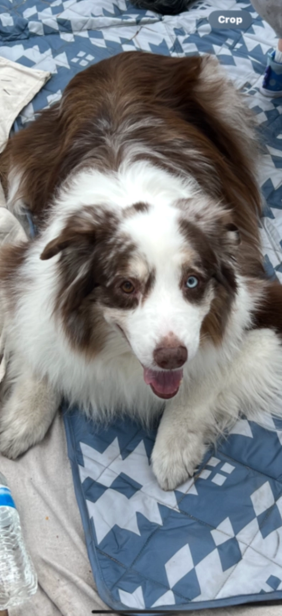 Australian Shepherd. One blue eye and one brown eye. Very old.