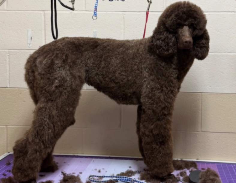 Winnie is a brown standard poodle. She may be nervous when meeting people but is very seeet