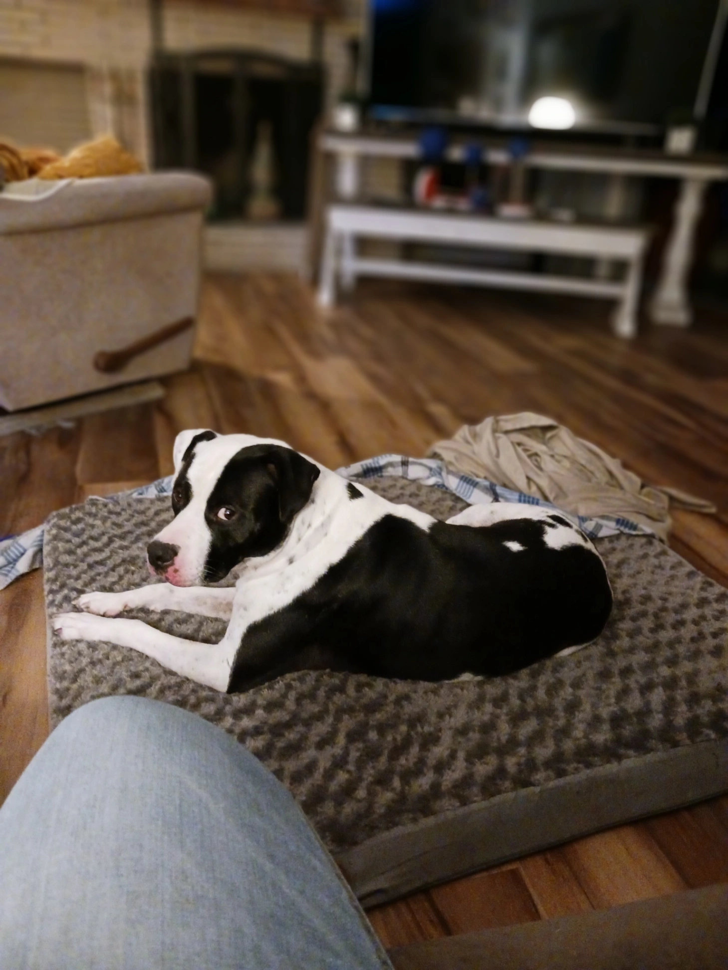 Gus is extremely friendly and extremely missed left with his blue and white polka dot collar